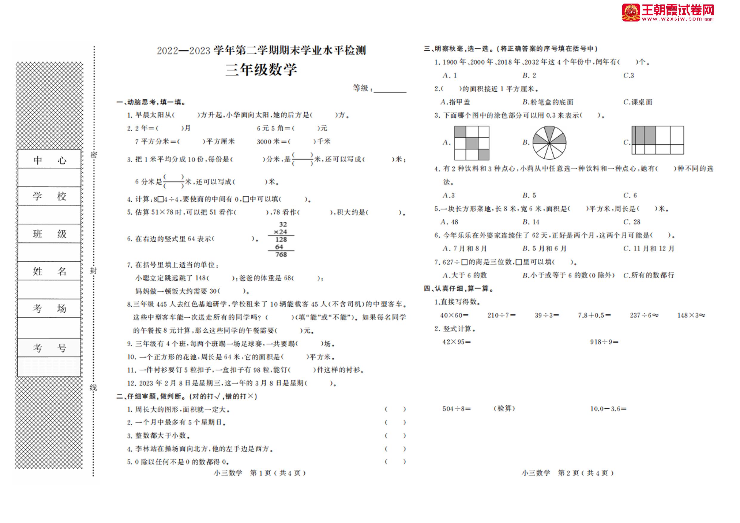 河北省石家庄市灵寿县2022-2023学年第二学期期末学业水平检测试题三年级数学(人教版)