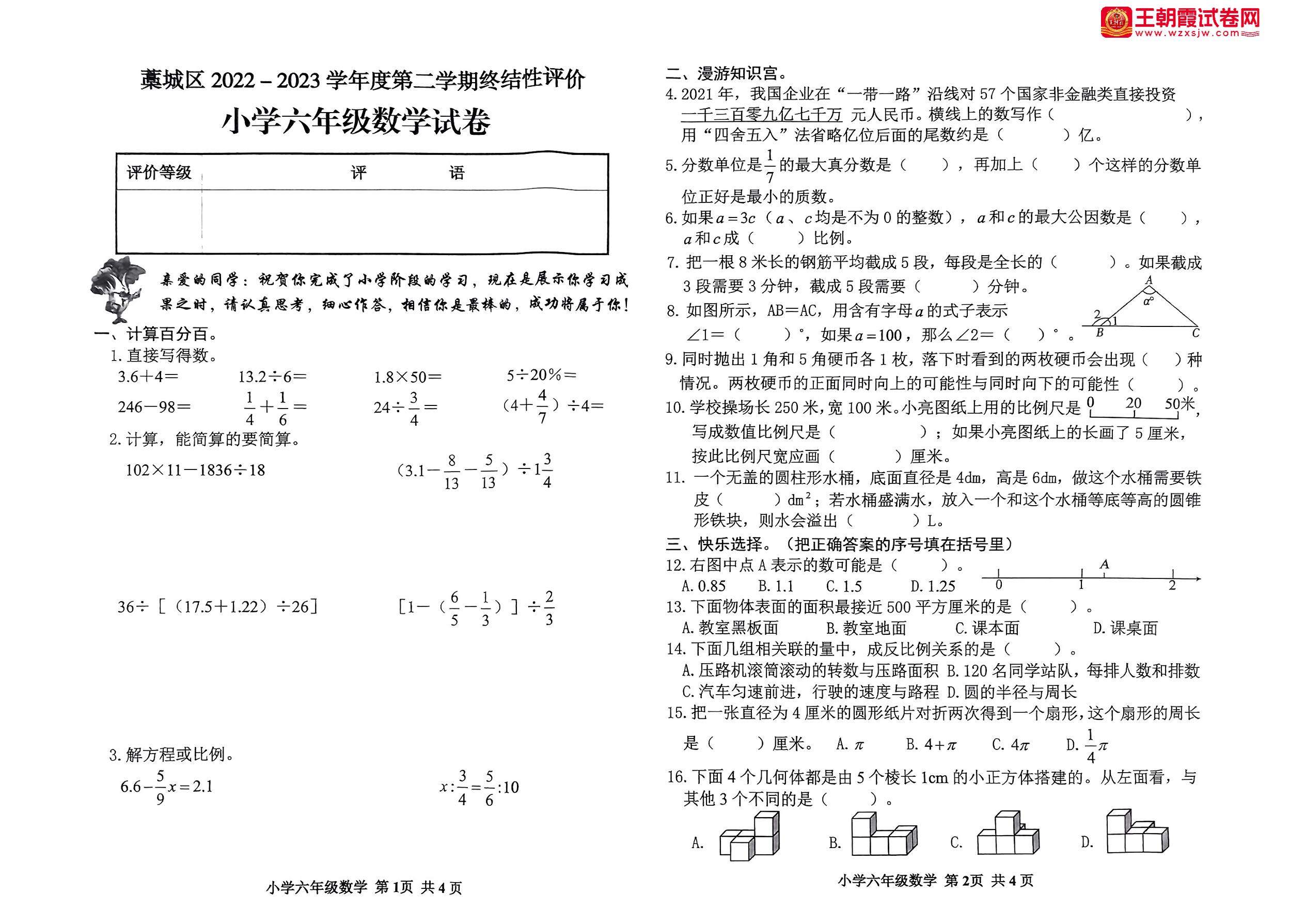 河北省石家庄市藁城区2022-2023学年度第二学期终结性评价试卷六年级数学(人教版)