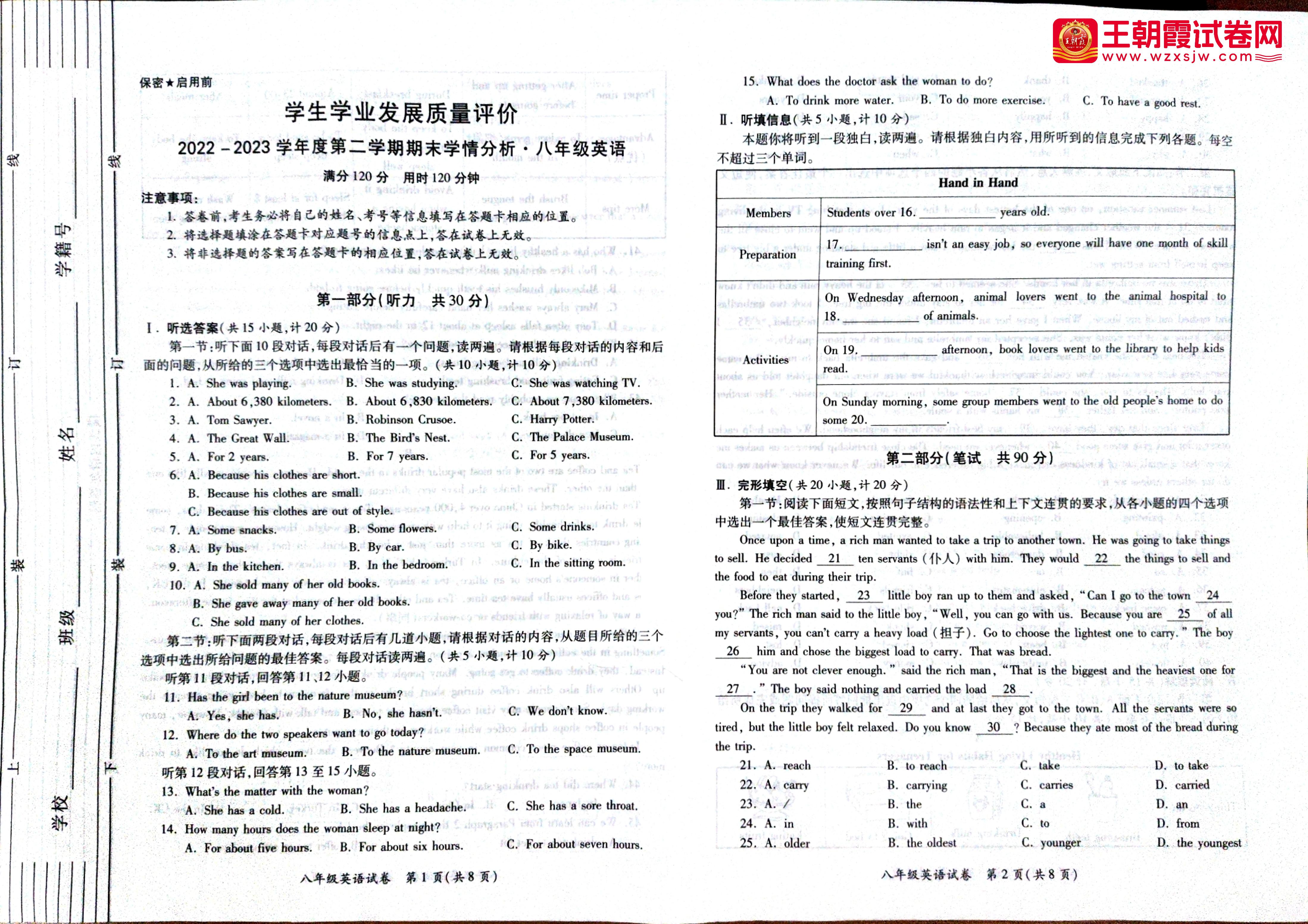 陕西省西安市经济开发区2022-2023学年度第二学期期末学情分析八年级英语(人教版)【无听力音频】