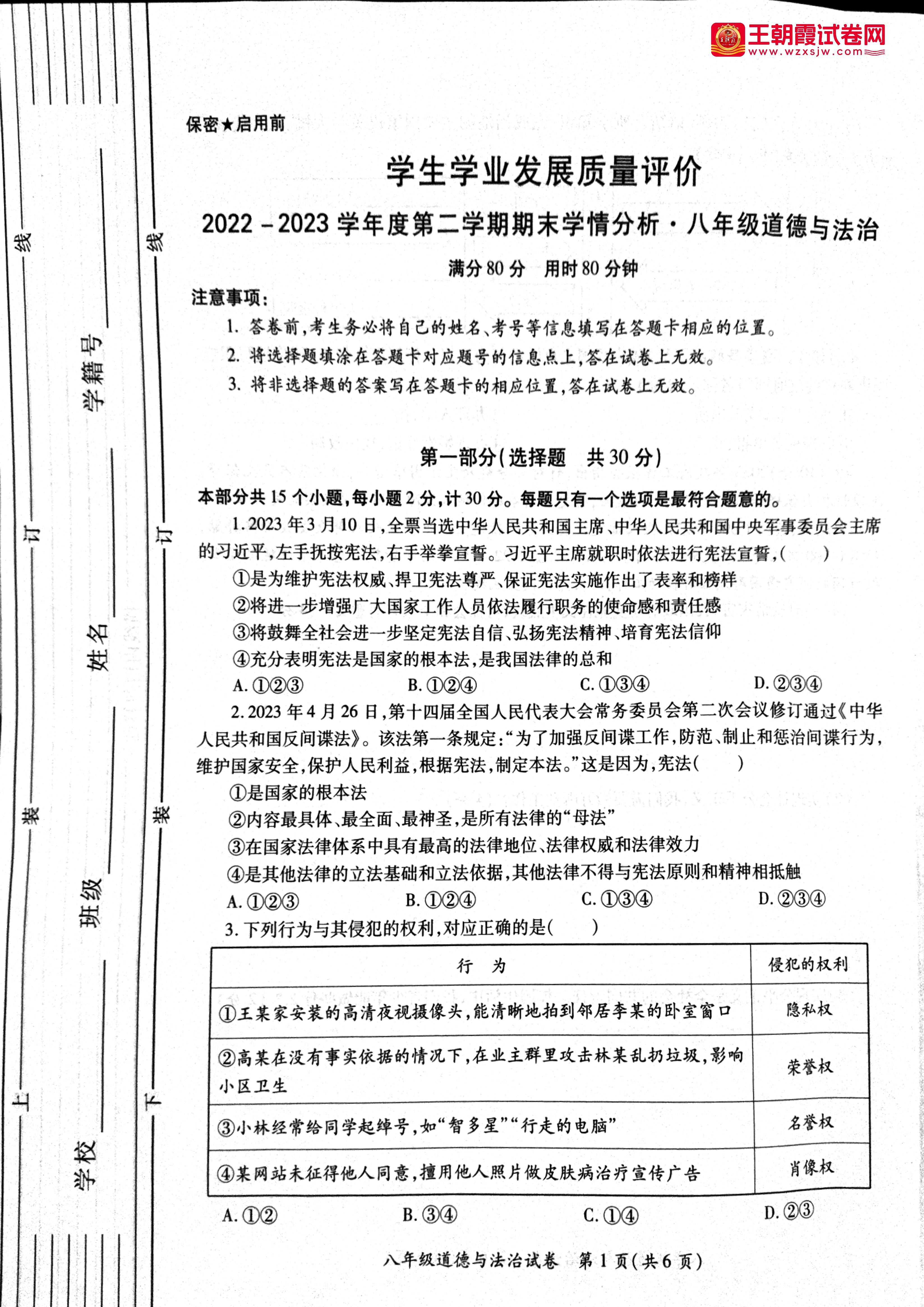 八年级道德与法治人教版下册期末卷