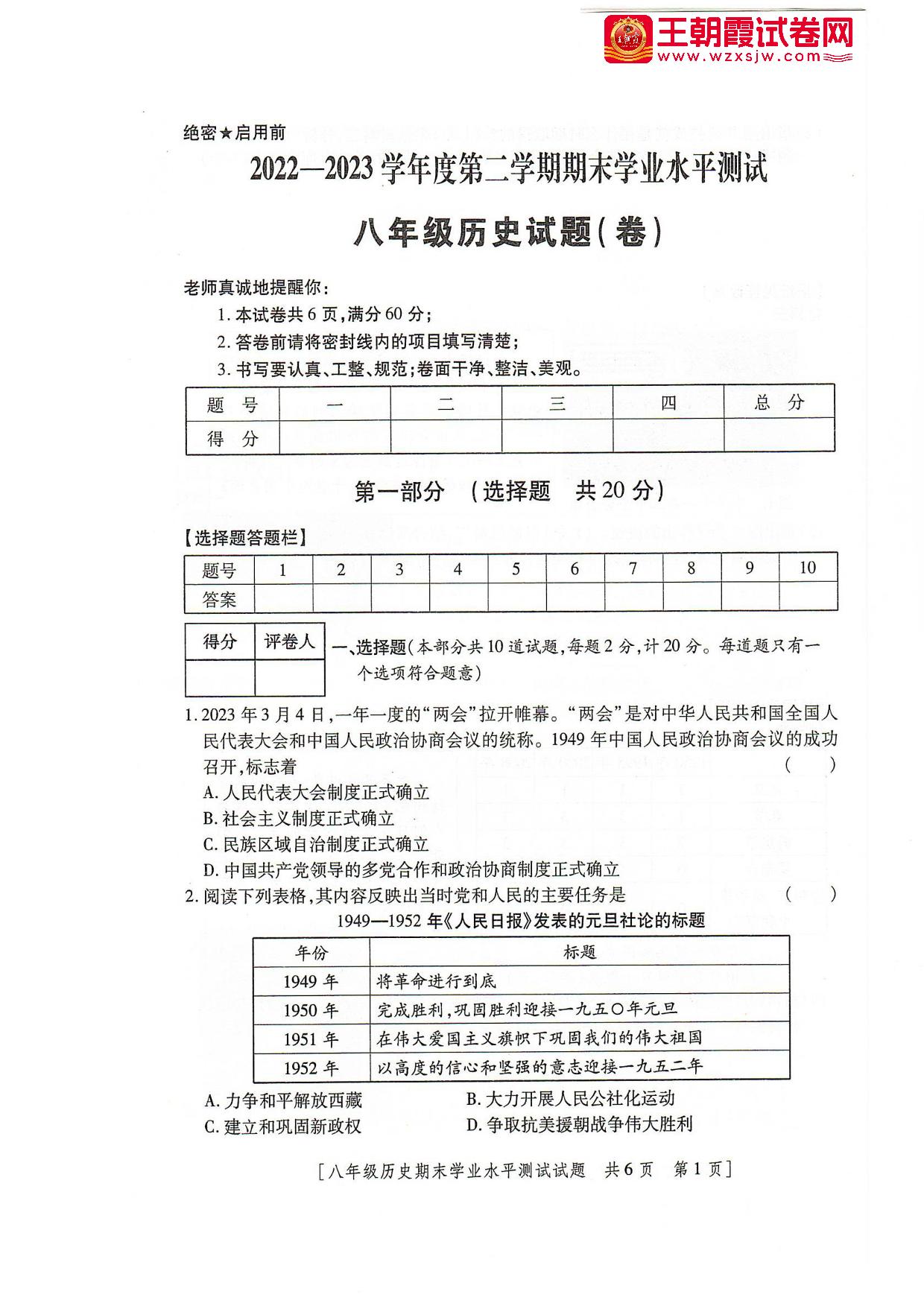 陕西省榆林市定边县第七中学2022-2023学年度第二学期期末学业水平测试八年级历史(人教版)
