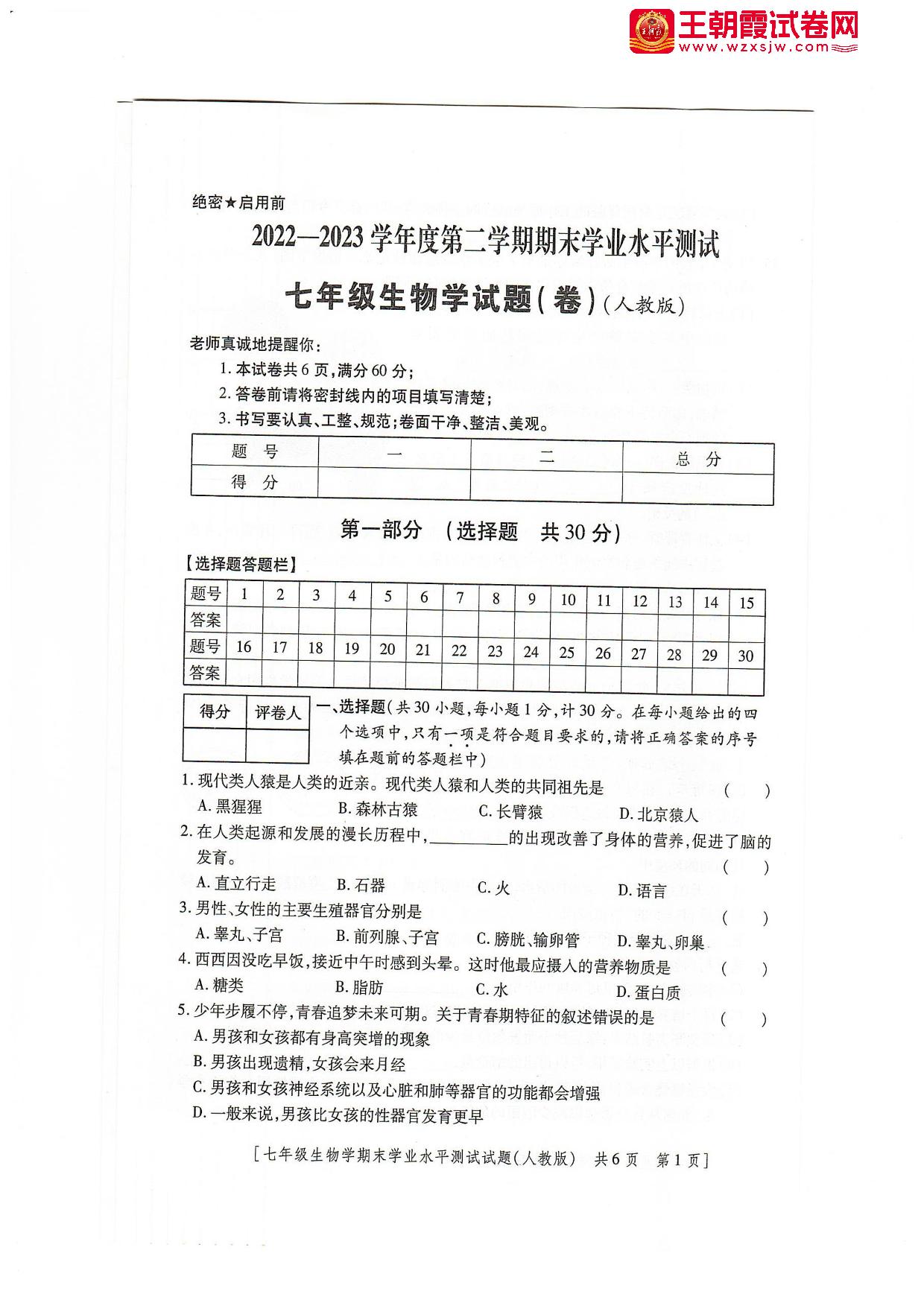 陕西省榆林市定边县第七中学2022-2023学年度第二学期期末学业水平测试七年级生物(人教版)