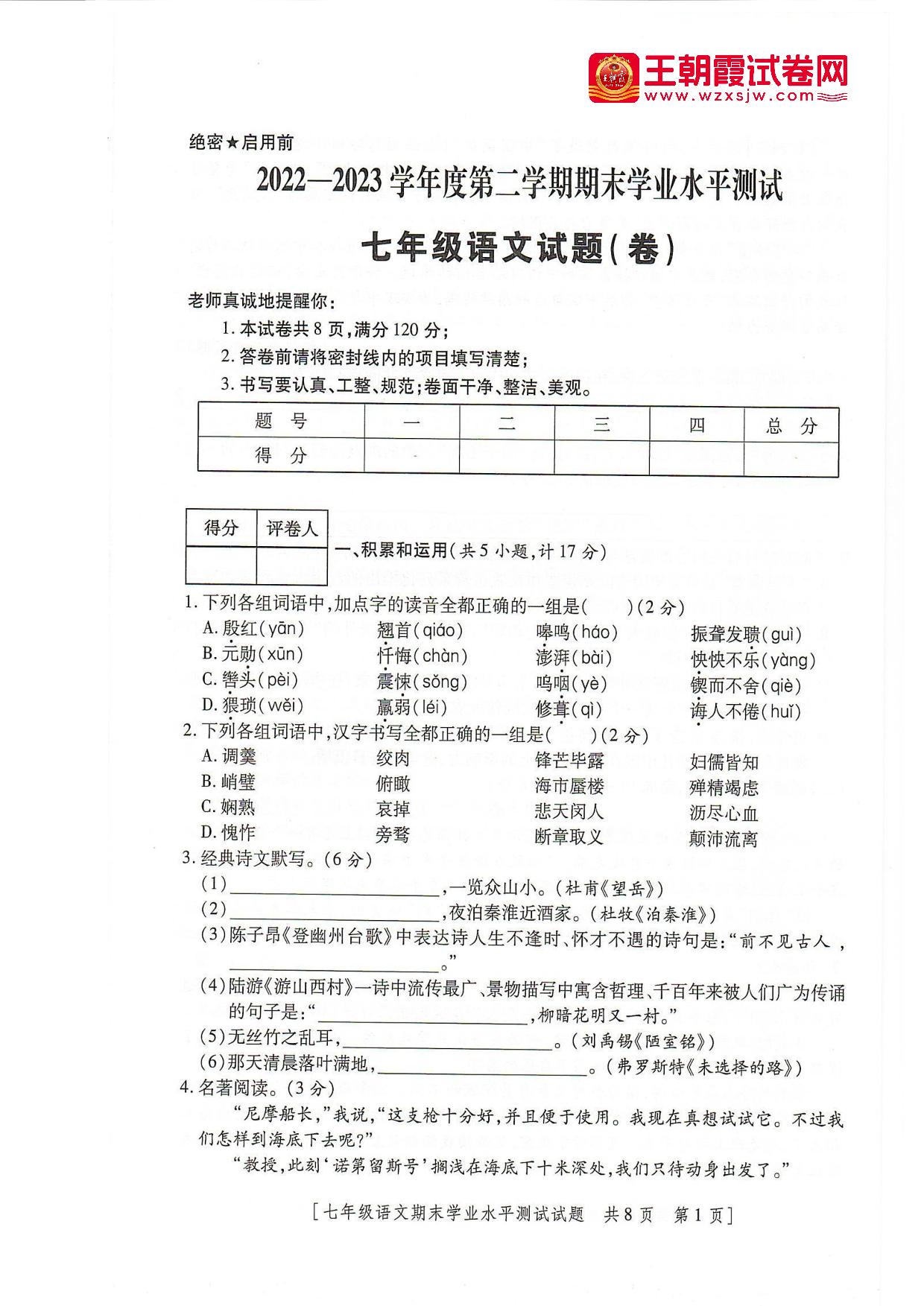 陕西省榆林市定边县第七中学2022-2023学年度第二学期期末学业水平测试七年级语文(人教版)