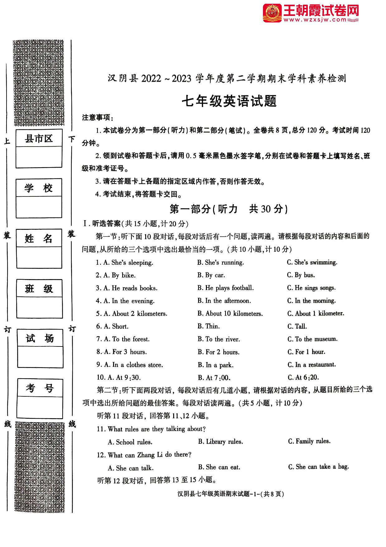 陕西省安康市汉阴县2022-2023学年度第二学期期末学科素养检测七年级英语(人教版)【无听力音频】