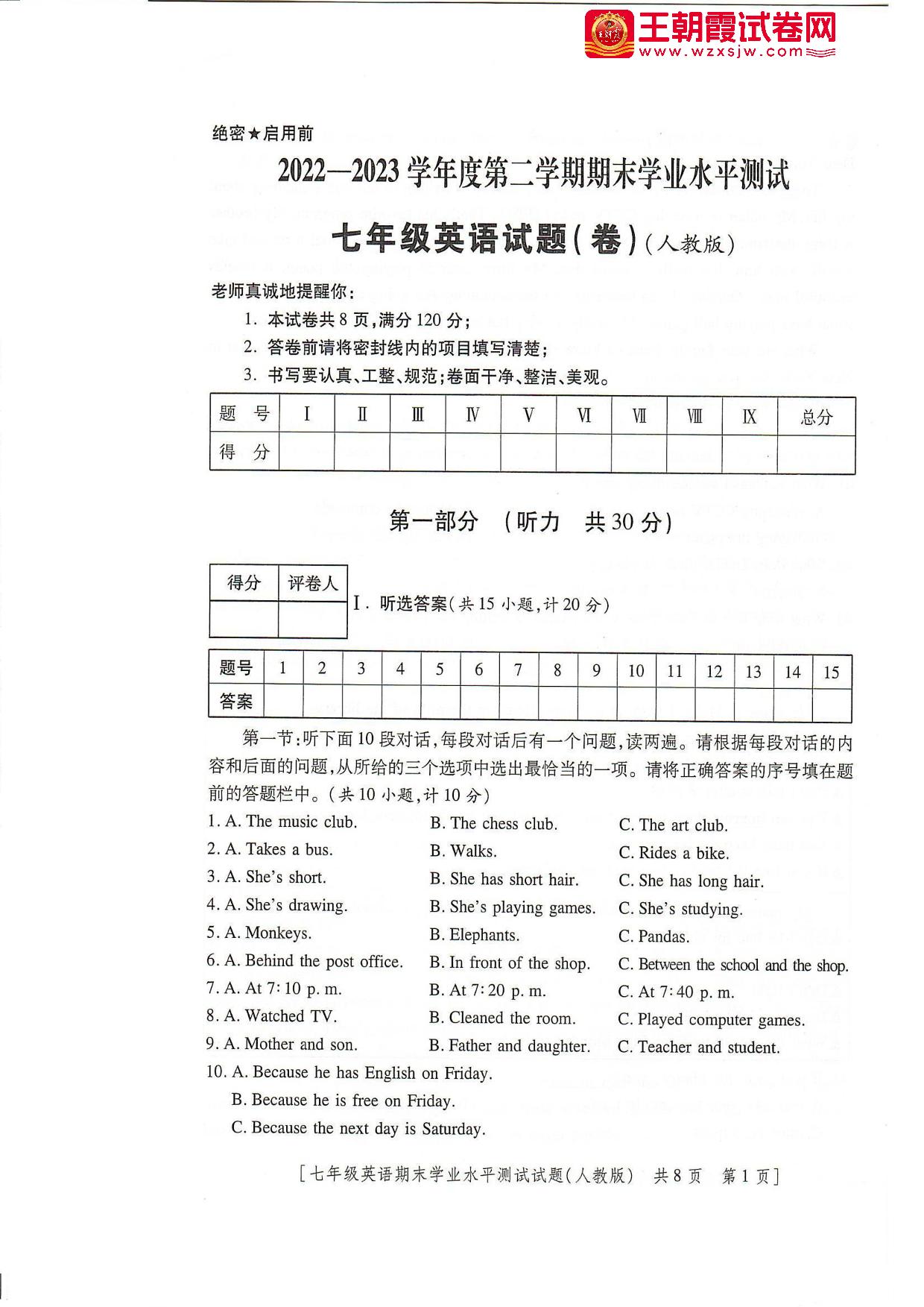 陕西省榆林市定边县第七中学2022-2023学年度第二学期期末学业水平测试七年级英语(人教版)