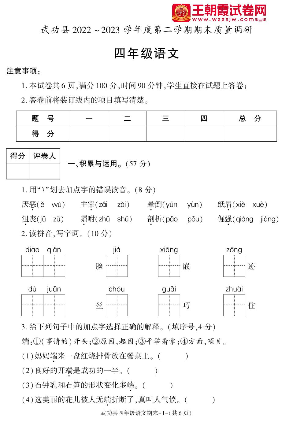 陕西省咸阳市武功县2022-2023学年度第二学期期末质量调研四年级语文(人教版)