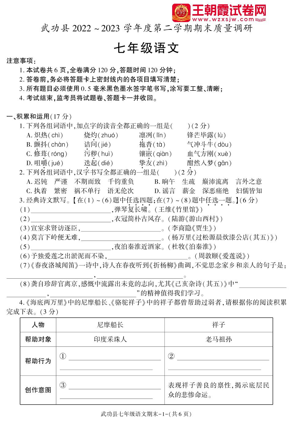 陕西省咸阳市武功县2022-2023学年度第二学期期末质量调研七年级语文(人教版)