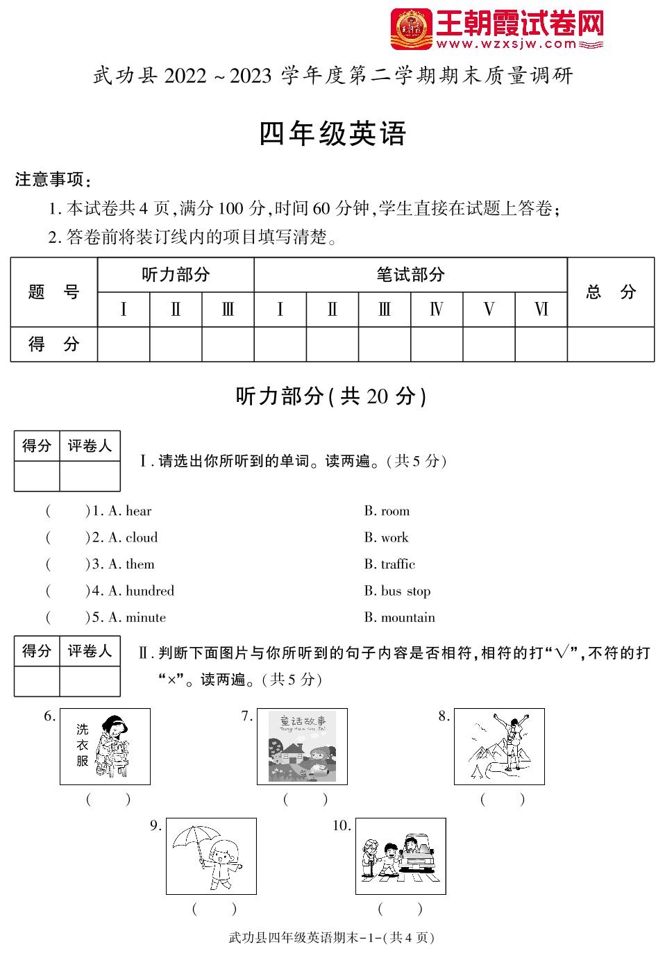 陕西省咸阳市武功县2022-2023学年度第二学期期末质量调研四年级英语(人教PEP版)【无听力音频】