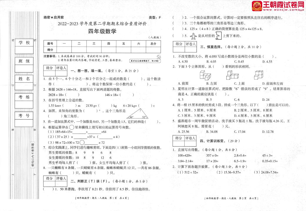 陕西省延安市富县2022-2023学年度第二学期期末综合素质评价四年级数学(人教版)