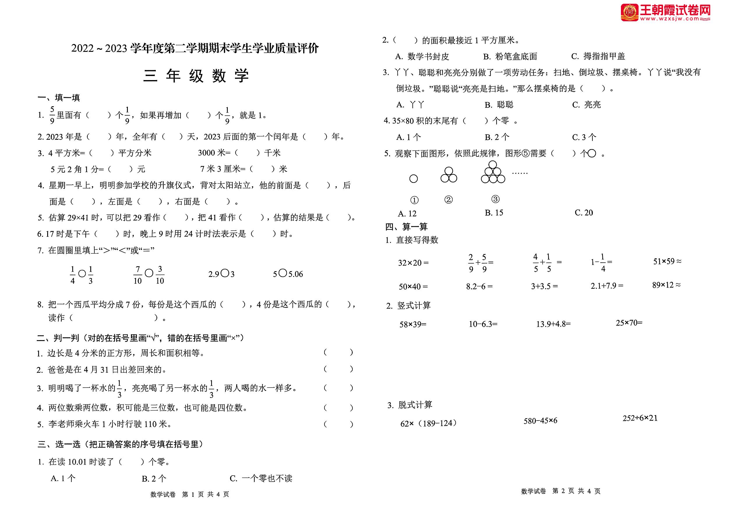 河北省石家庄市栾城区2022-2023学年第二学期期末学生学业质量评价三年级数学(冀教版)