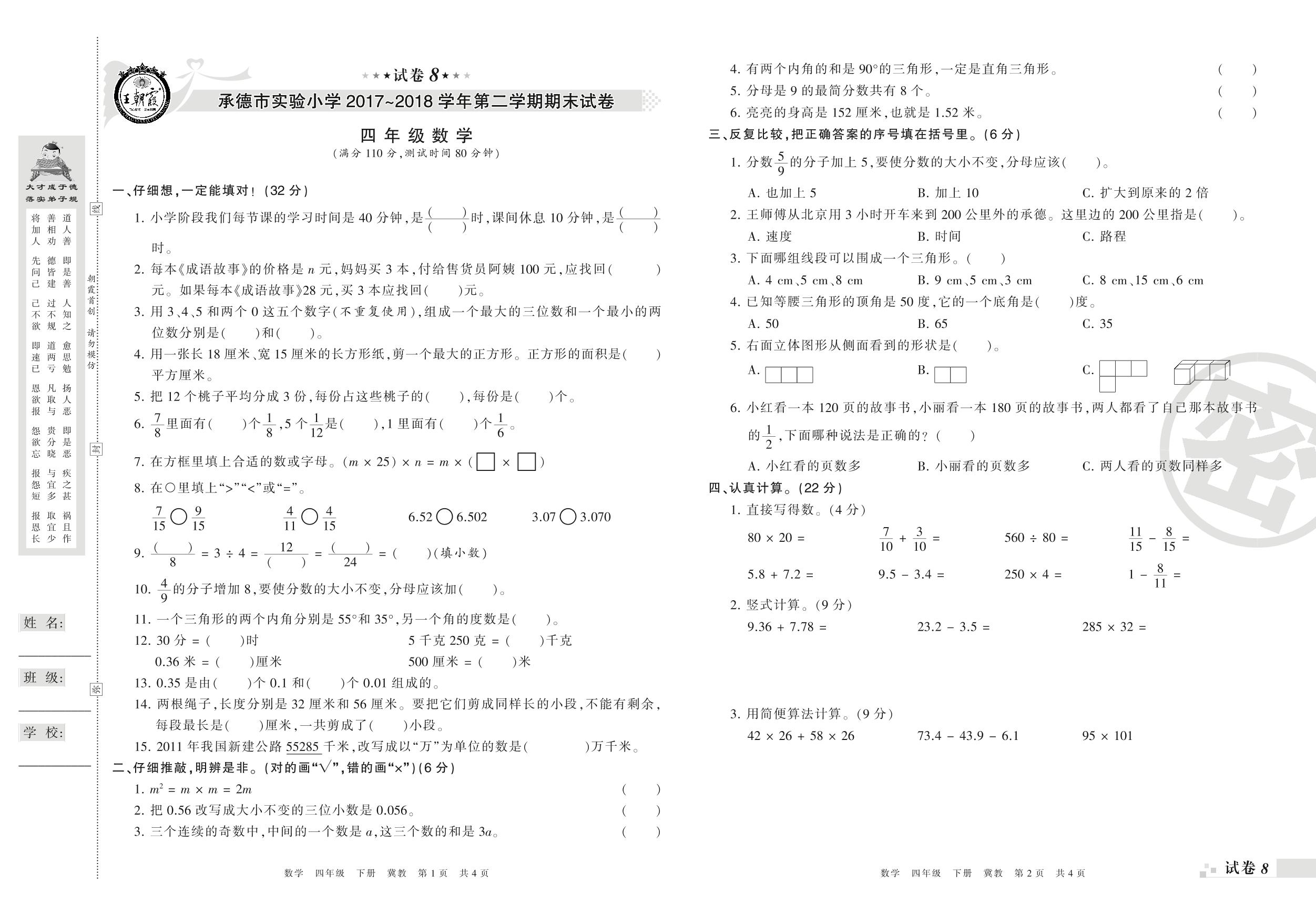 2017-2018学年第二学期承德市实验小学四年级数学试卷(冀教版)【8】