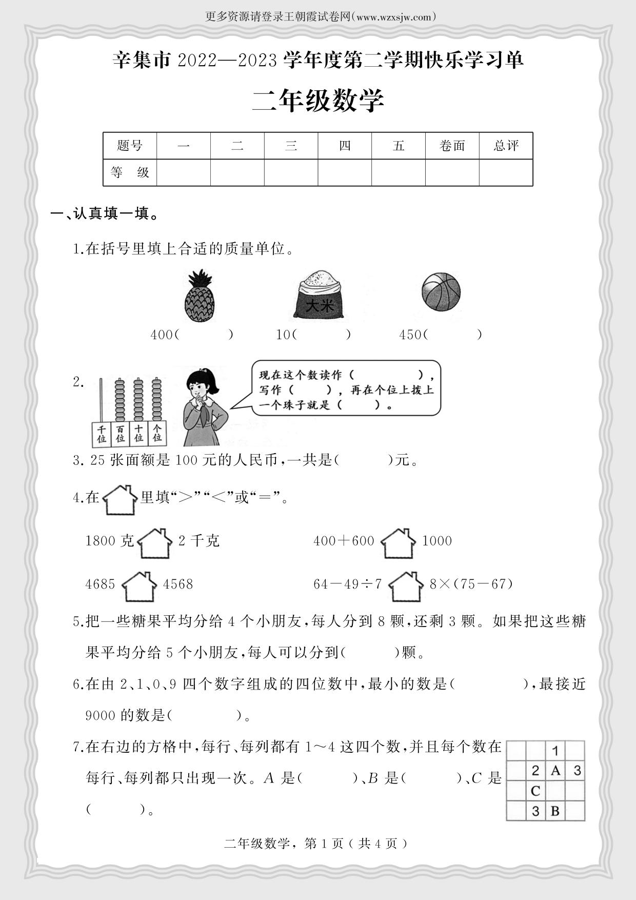 河北省石家庄市辛集市2022-2023学年度第二学期期末快乐学习单二年级数学(人教版)