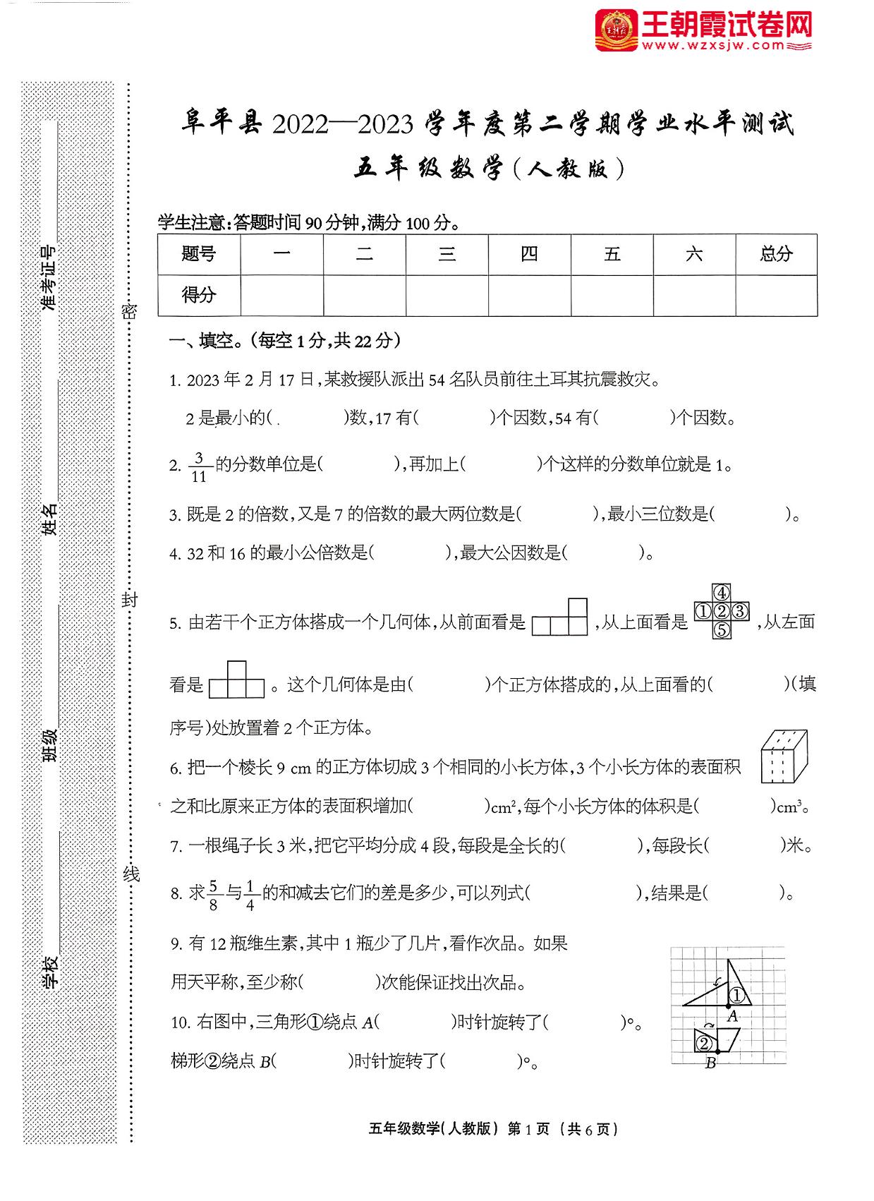 河北省保定市阜平县2022-2023学年度第二学期期末学业水平测试五年级数学(人教版)