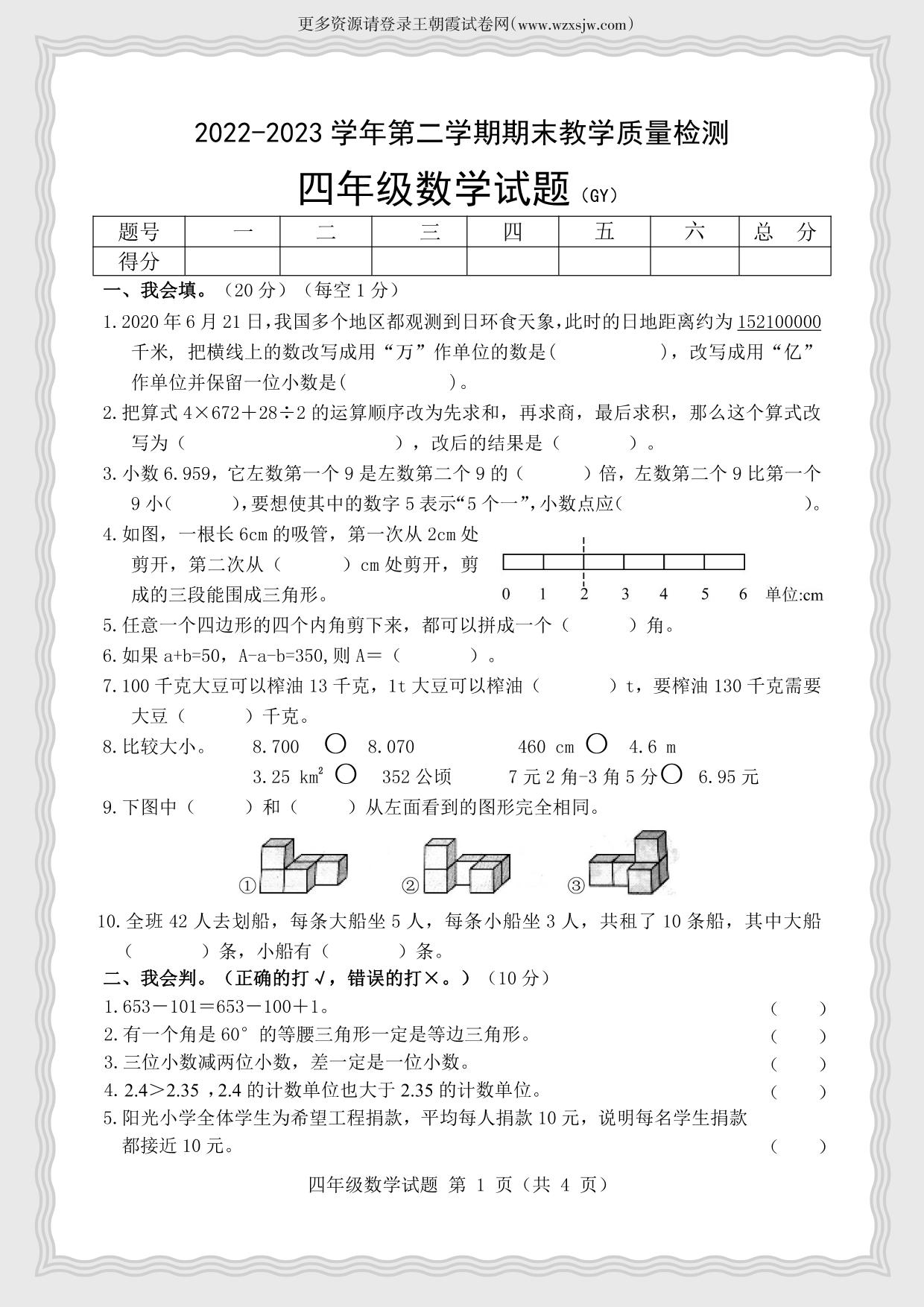 河北省保定市高阳县2022-2023学年第二学期期末教学质量检测试题四年级数学(人教版)