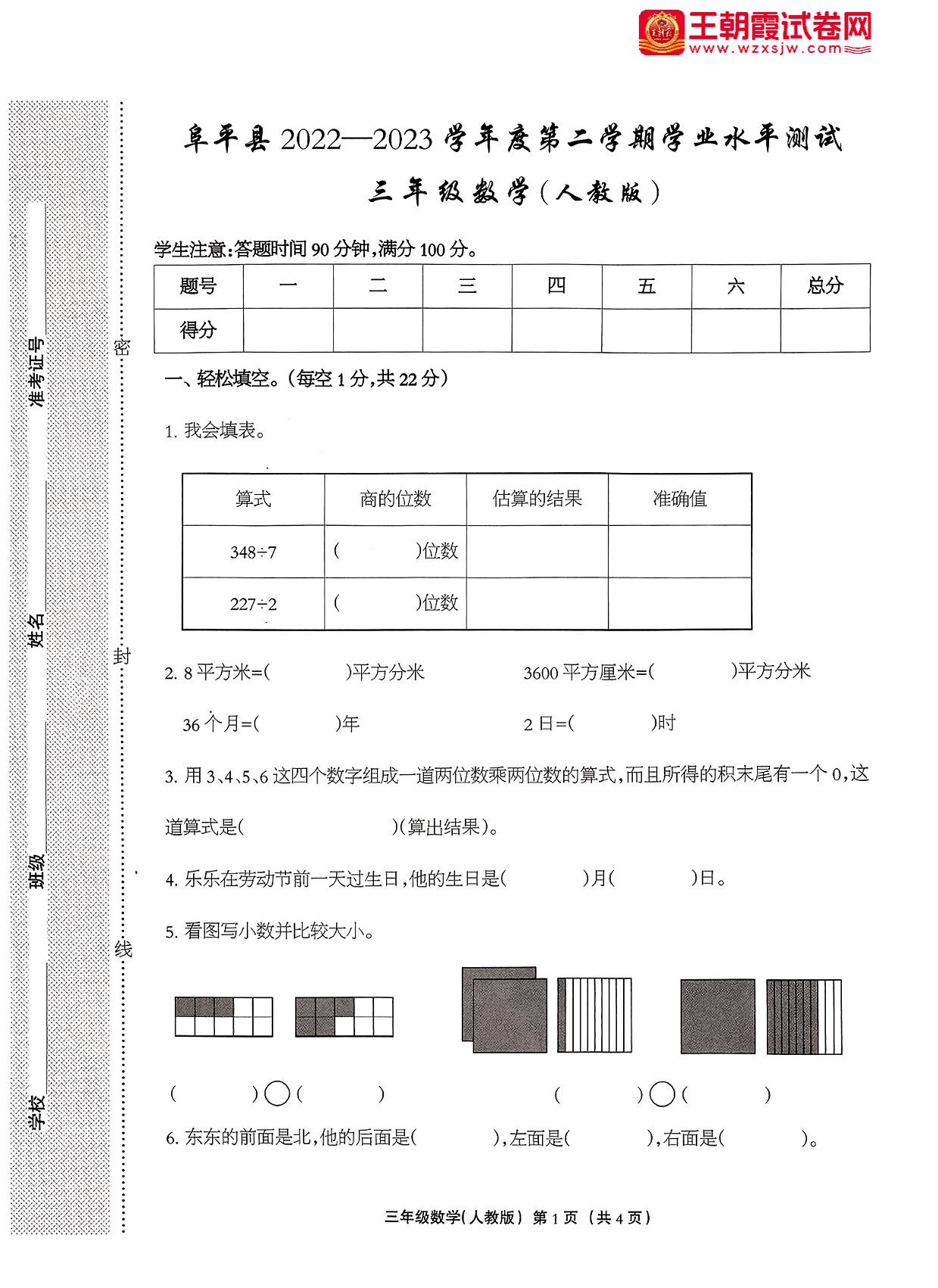 河北省保定市阜平县2022-2023学年度第二学期期末学业水平测试三年级数学(人教版)