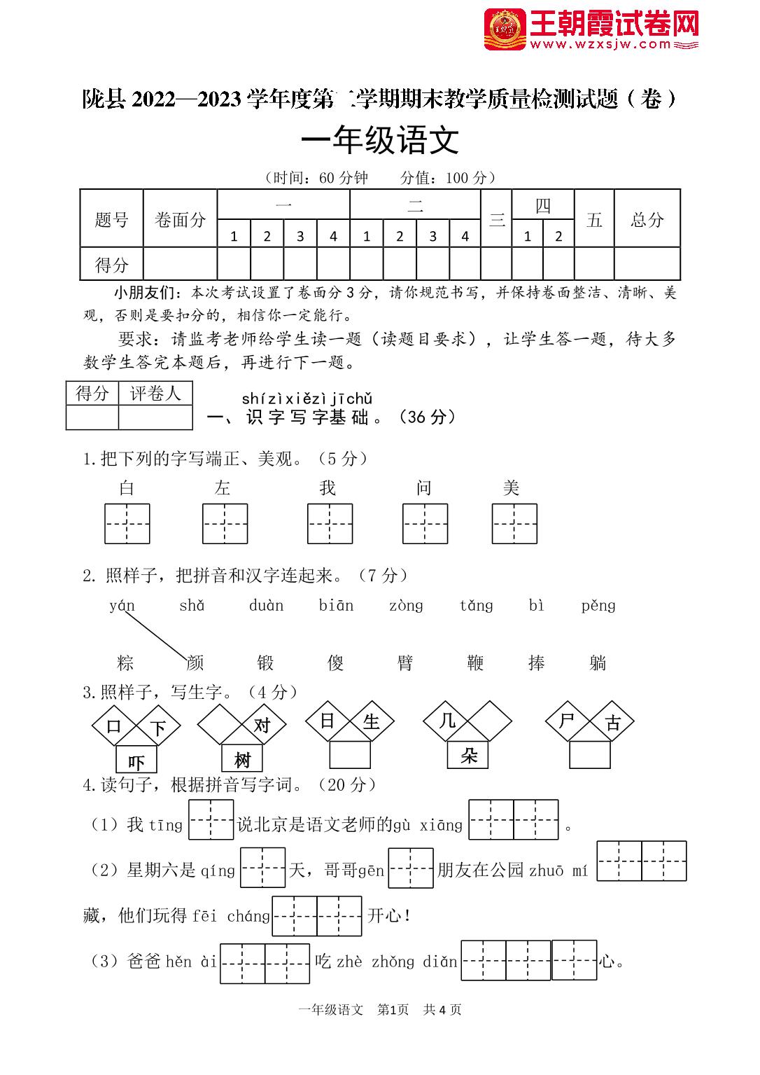 陕西省宝鸡市陇县2022-2023学年度第二学期期末教学质量检测一年级语文(人教版)
