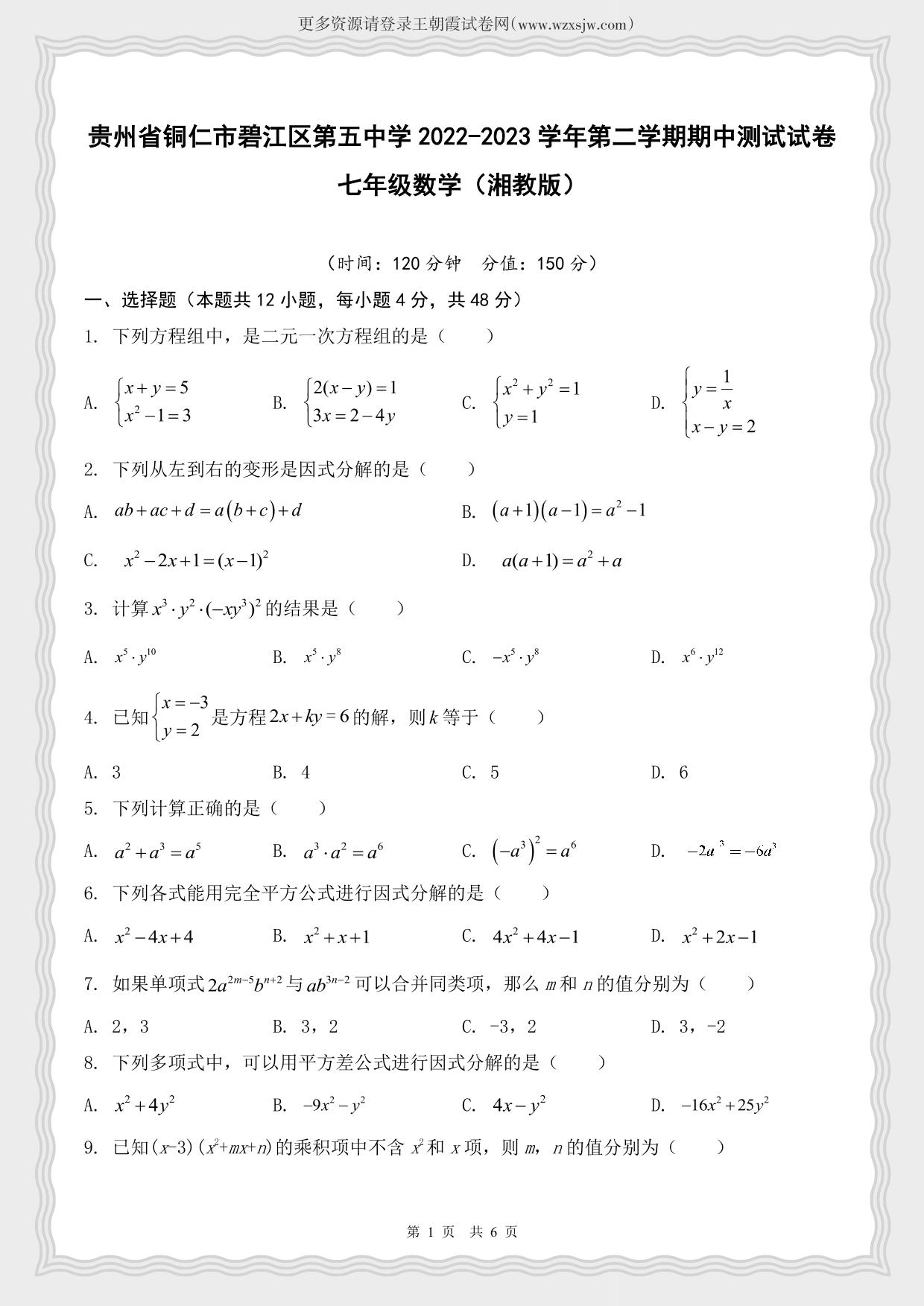 贵州省铜仁市碧江区第五中学2022-2023学年度第二学期期中测试试卷七年级数学(湘教版)