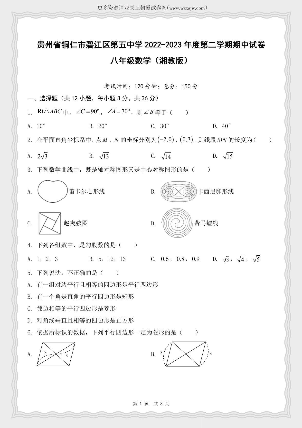 贵州省铜仁市第五中学2022-2023学年度第二学期期中试卷八年级数学(湘教版)