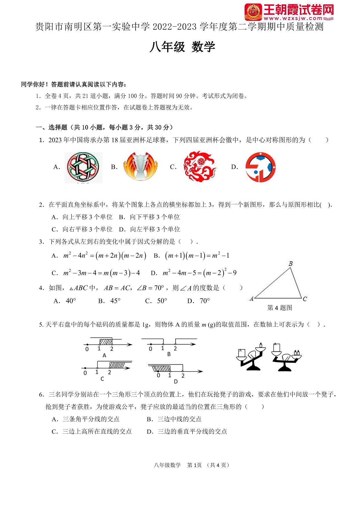 贵州省贵阳市南明区第一实验中学2022-2023学年度第二学期期中质量检测八年级数学(北师版)