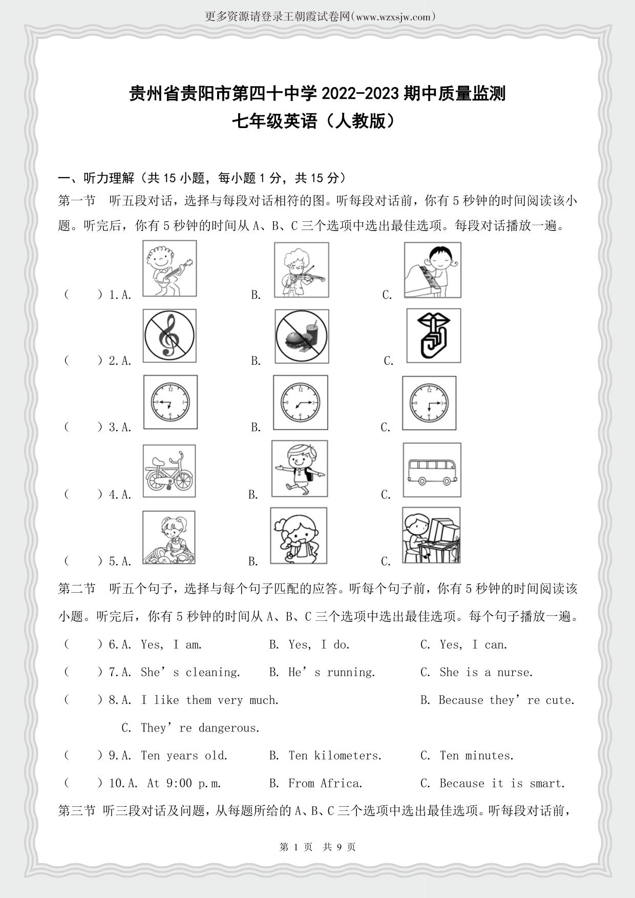 贵州省贵阳市第四十中学2022-2023学年下学期期中质量监测试卷七年级英语(人教版)【无听力音频】