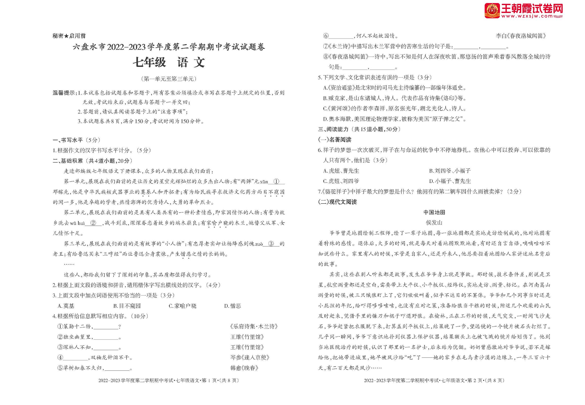 贵州省六盘水市2022-2023学年度第二学期期中考试七年级语文(人教版)