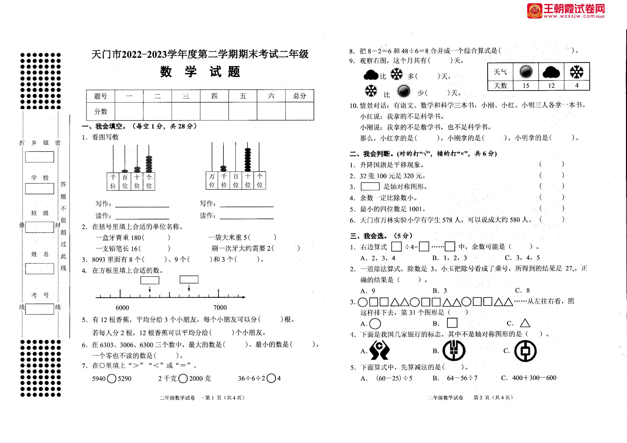 湖北省天门市2022-2023学年下学期6月期末试题二年级数学(人教版)
