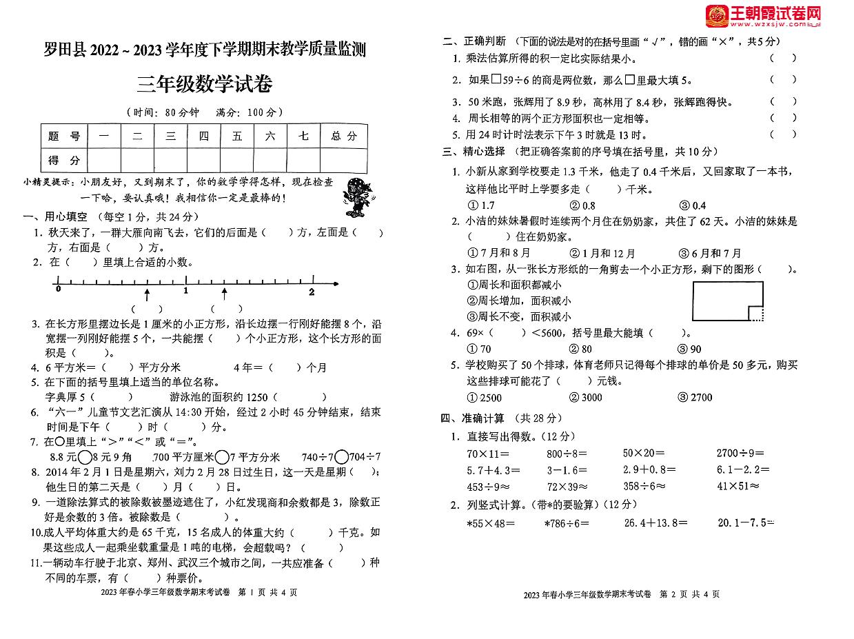 湖北省黄冈市罗田县2022-2023学年期末质量监测试题三年级数学(人教版)