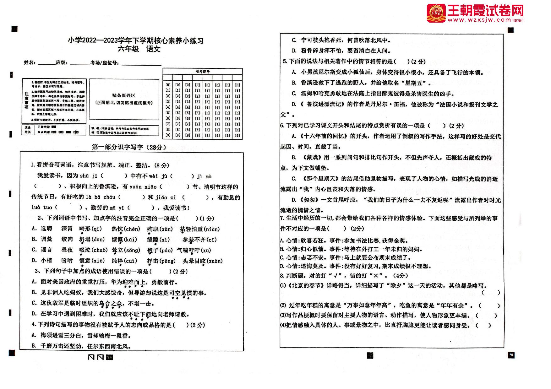 六年级语文人教版下册期中卷
