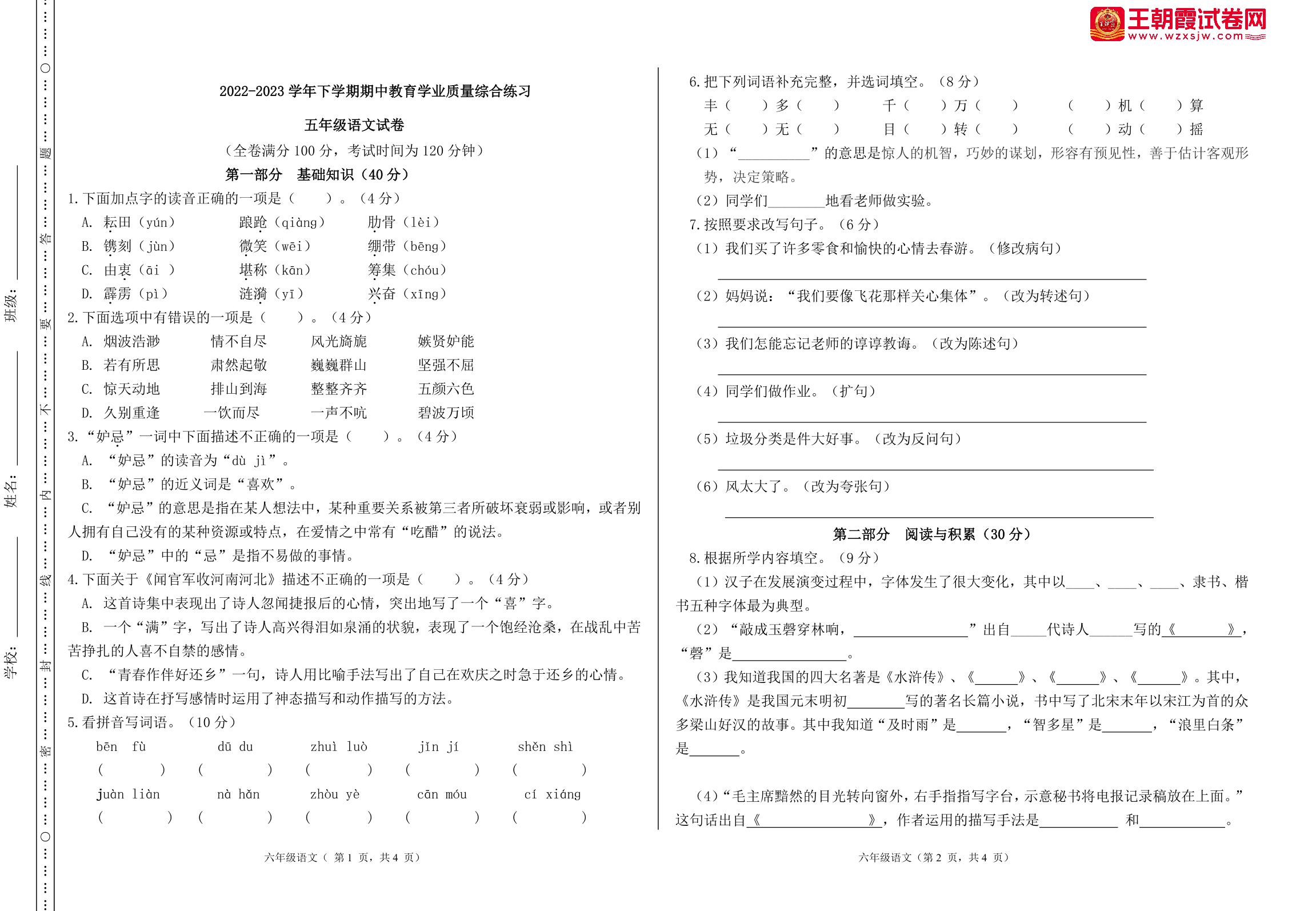 云南省楚雄州双柏县2022-2023学年下学期期中教育学业质量综合练习五年级语文(人教版)