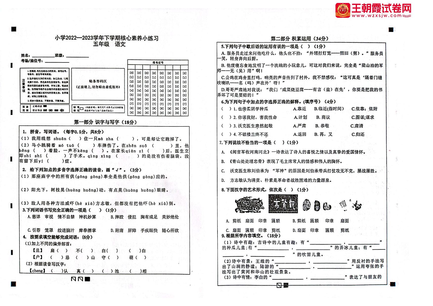 五年级语文人教版下册期中卷