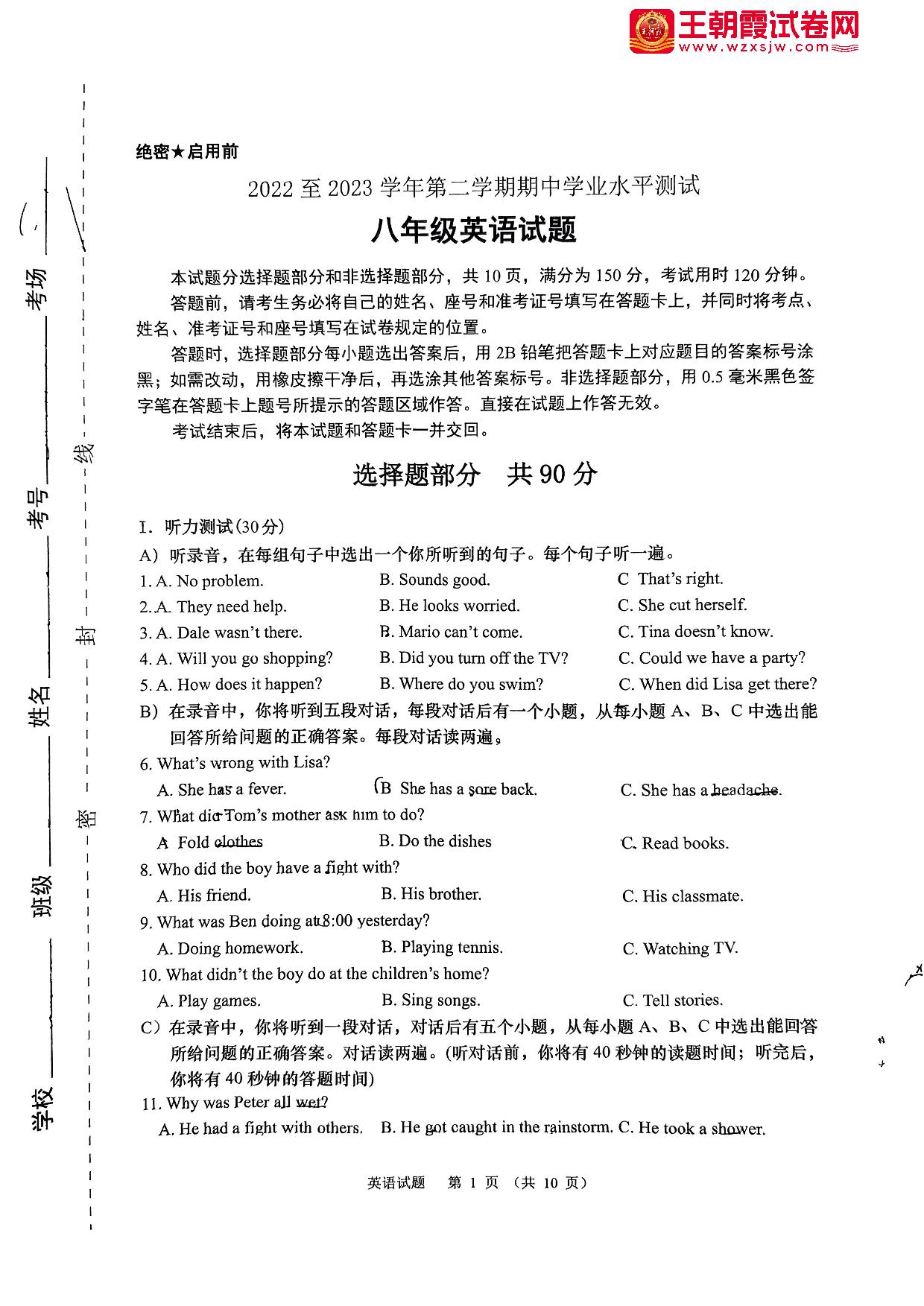 八年级英语人教版下册期中卷