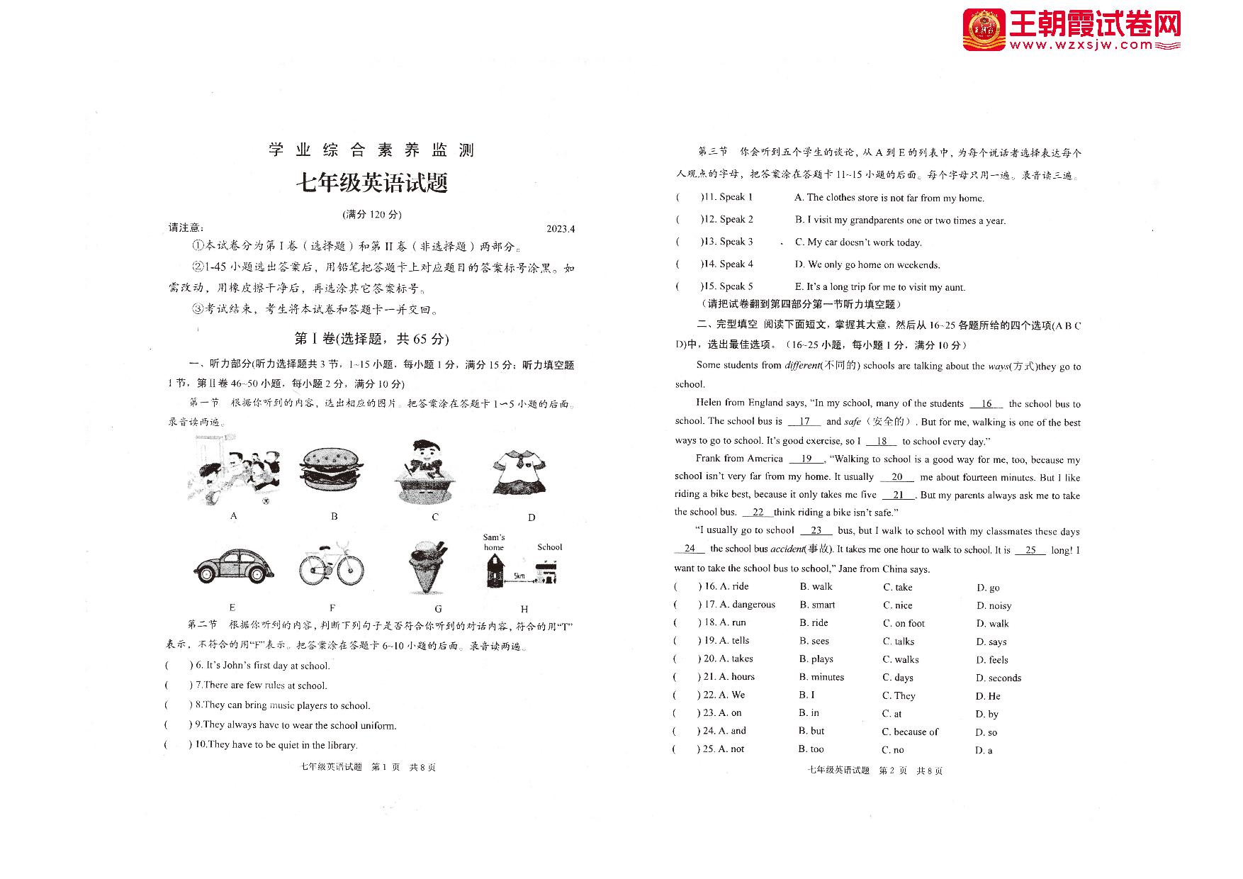 山东省枣庄市薛城区2022-2023学年下学期(期中)学业综合素养监测七年级英语(人教版)