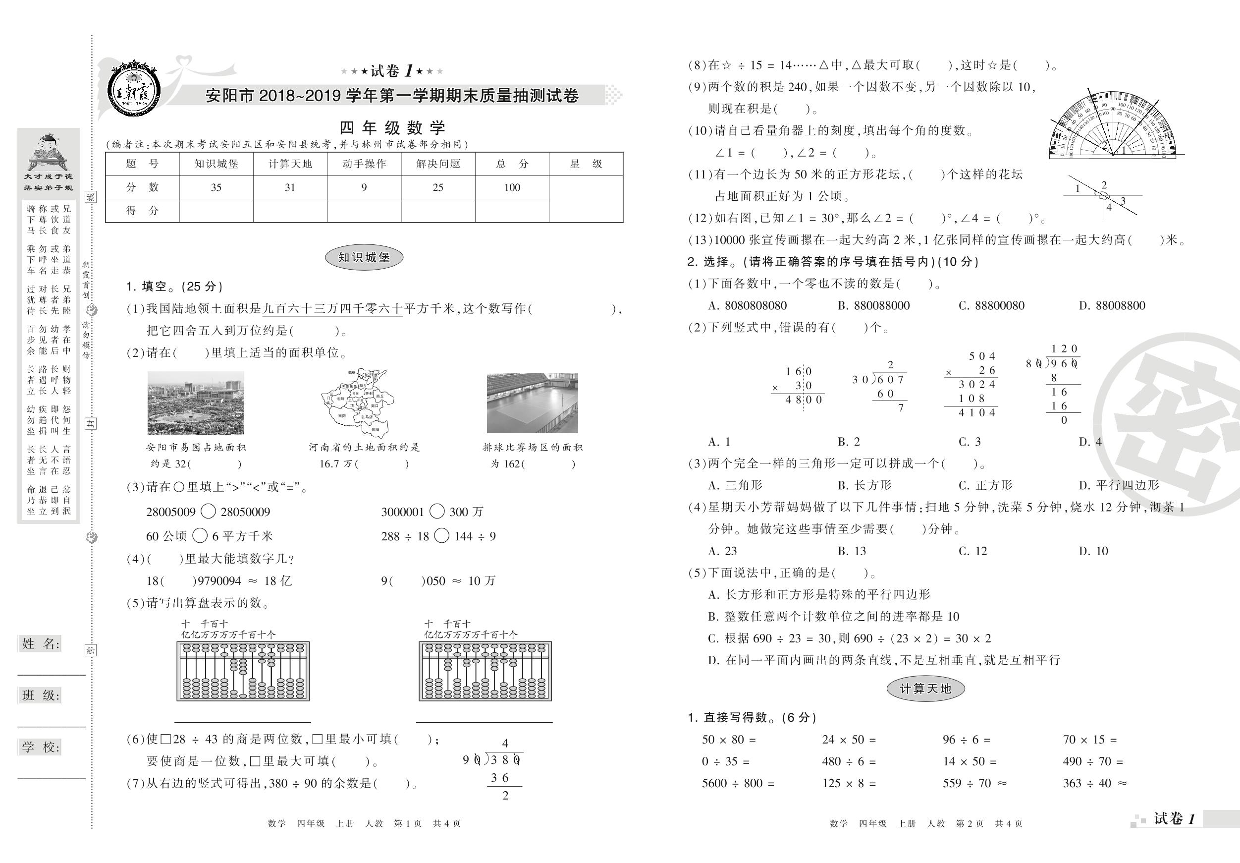 2018-2019学年第一学期安阳市四年级数学试卷(人教版)【1】