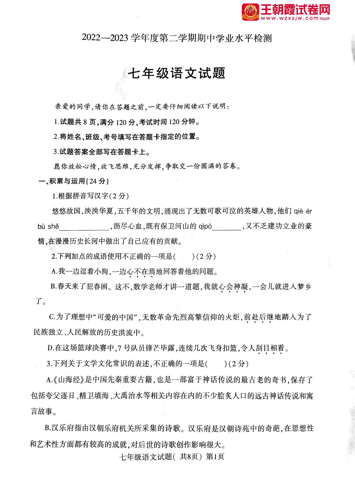 山东省聊城市莘县2022-2023学年度第二学期期中学业水平检测七年级语文(人教版)