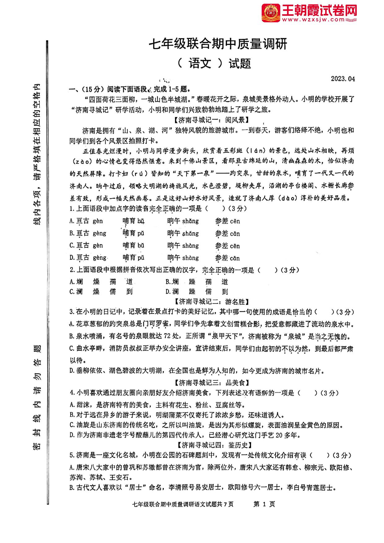 山东济南市中区四校联考(泉景、实验初中、育英、育秀)2022-2023学年下学期期中质量调研七年级语文(人教版)