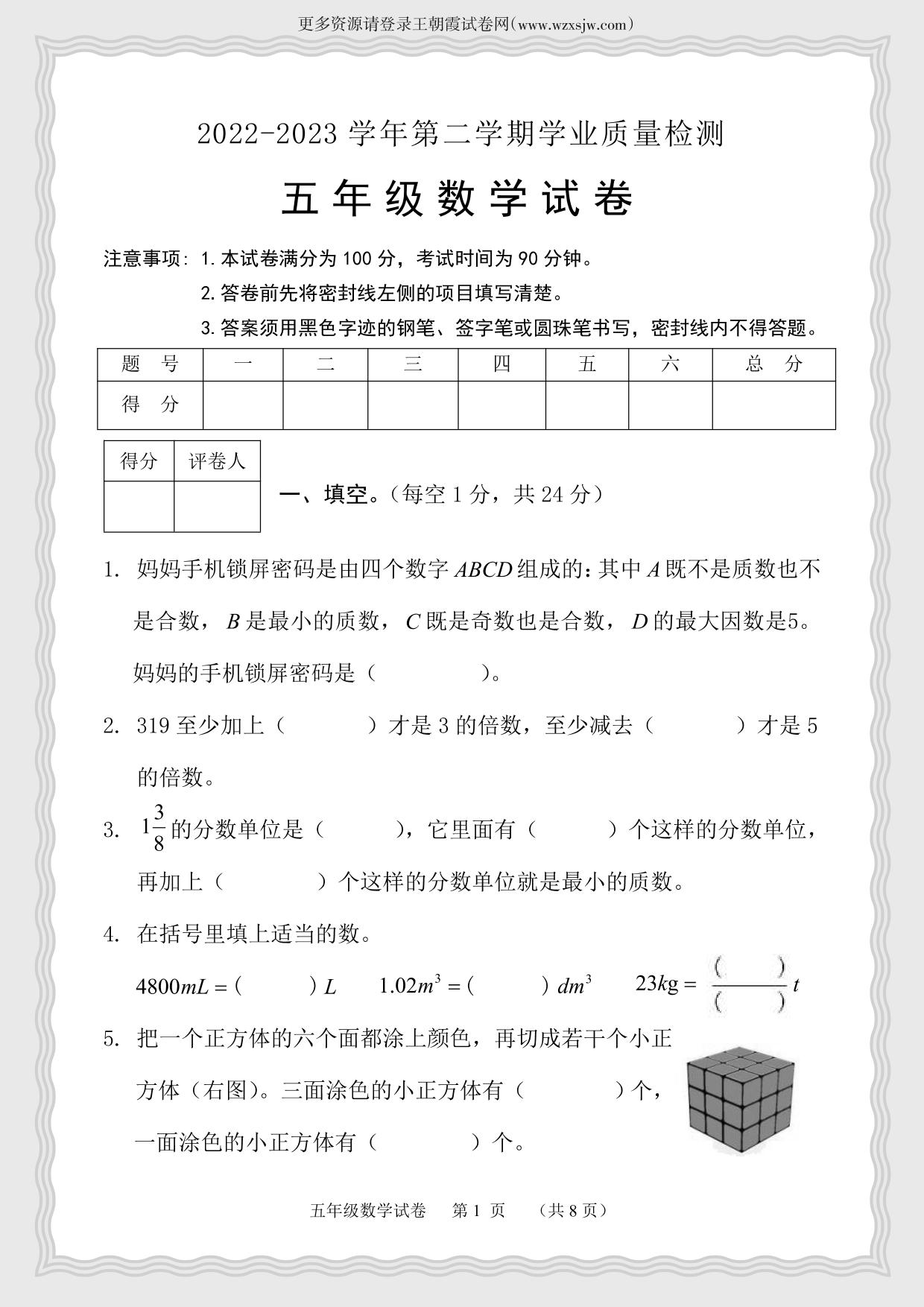 河北省保定市唐县2022-2023学年第二学期期末学业质量检测试卷五年级数学(人教版)