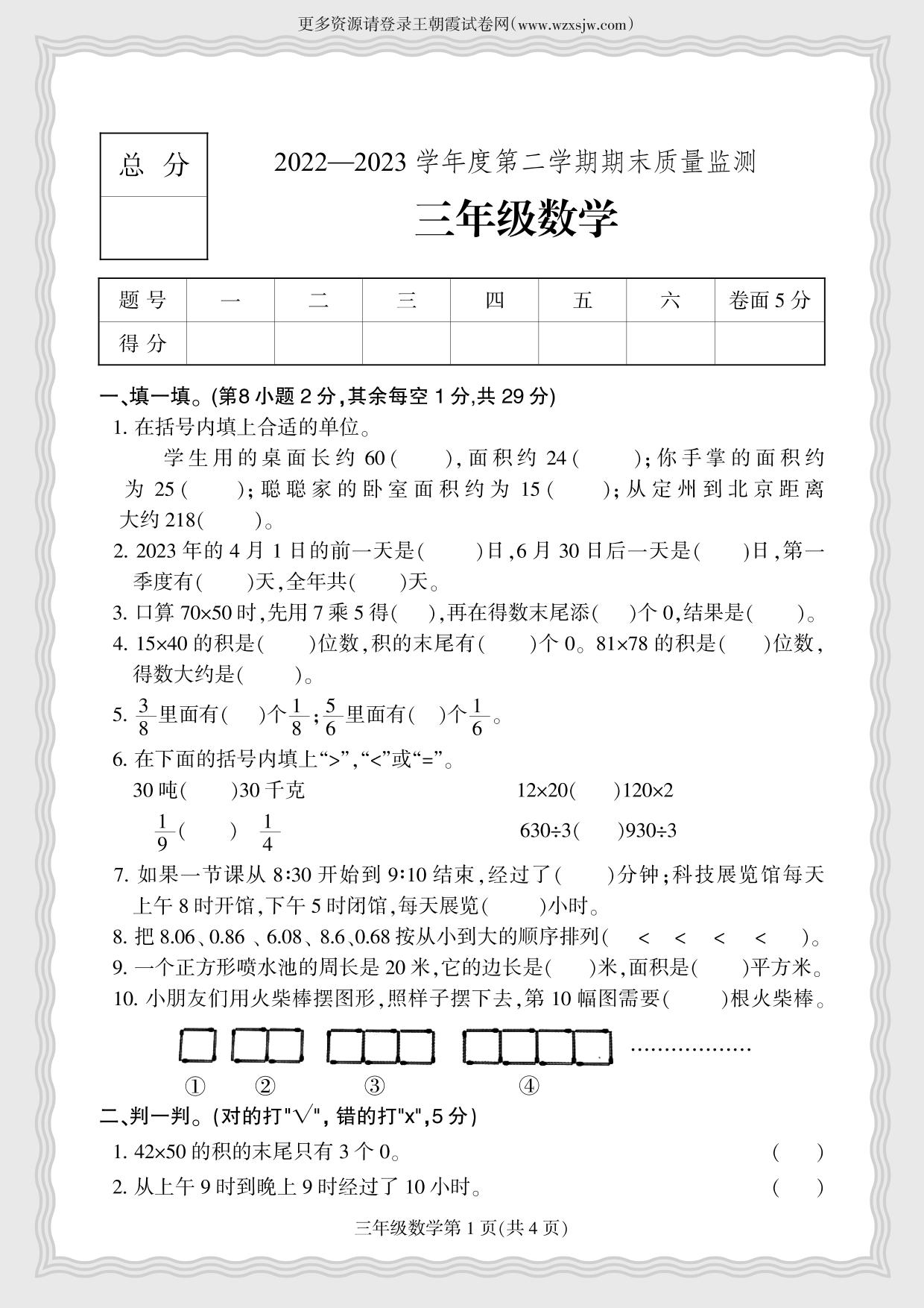 河北省保定市定州市2022-2023学年度第二学期期末质量检测三年级数学(冀教版)