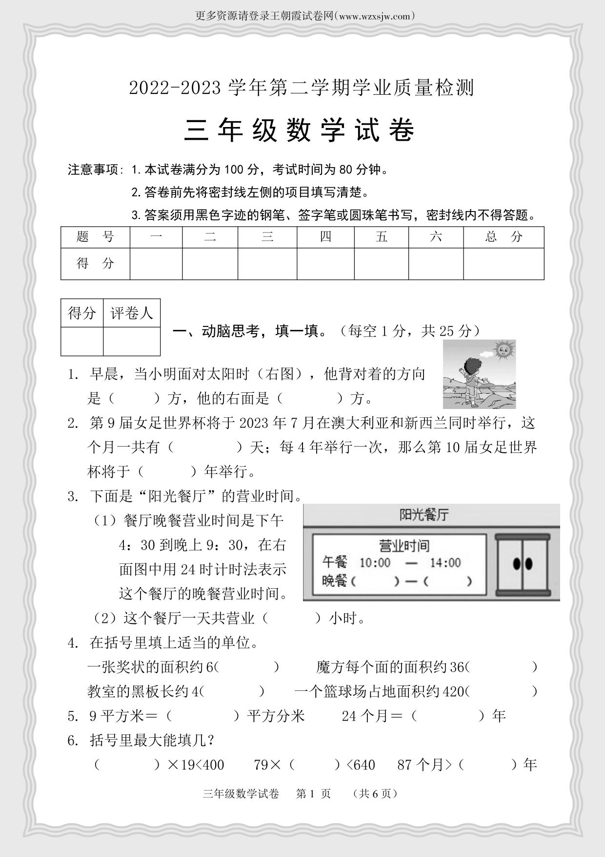 河北省保定市唐县2022-2023学年第二学期期末学业质量检测试卷三年级数学(人教版)