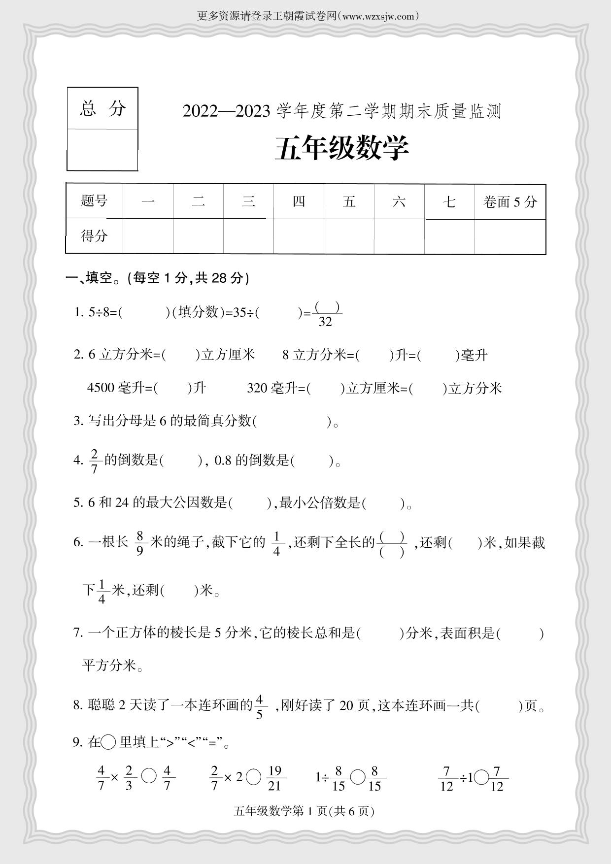 河北省保定市定州市2022-2023学年度第二学期期末质量检测五年级数学(冀教版)
