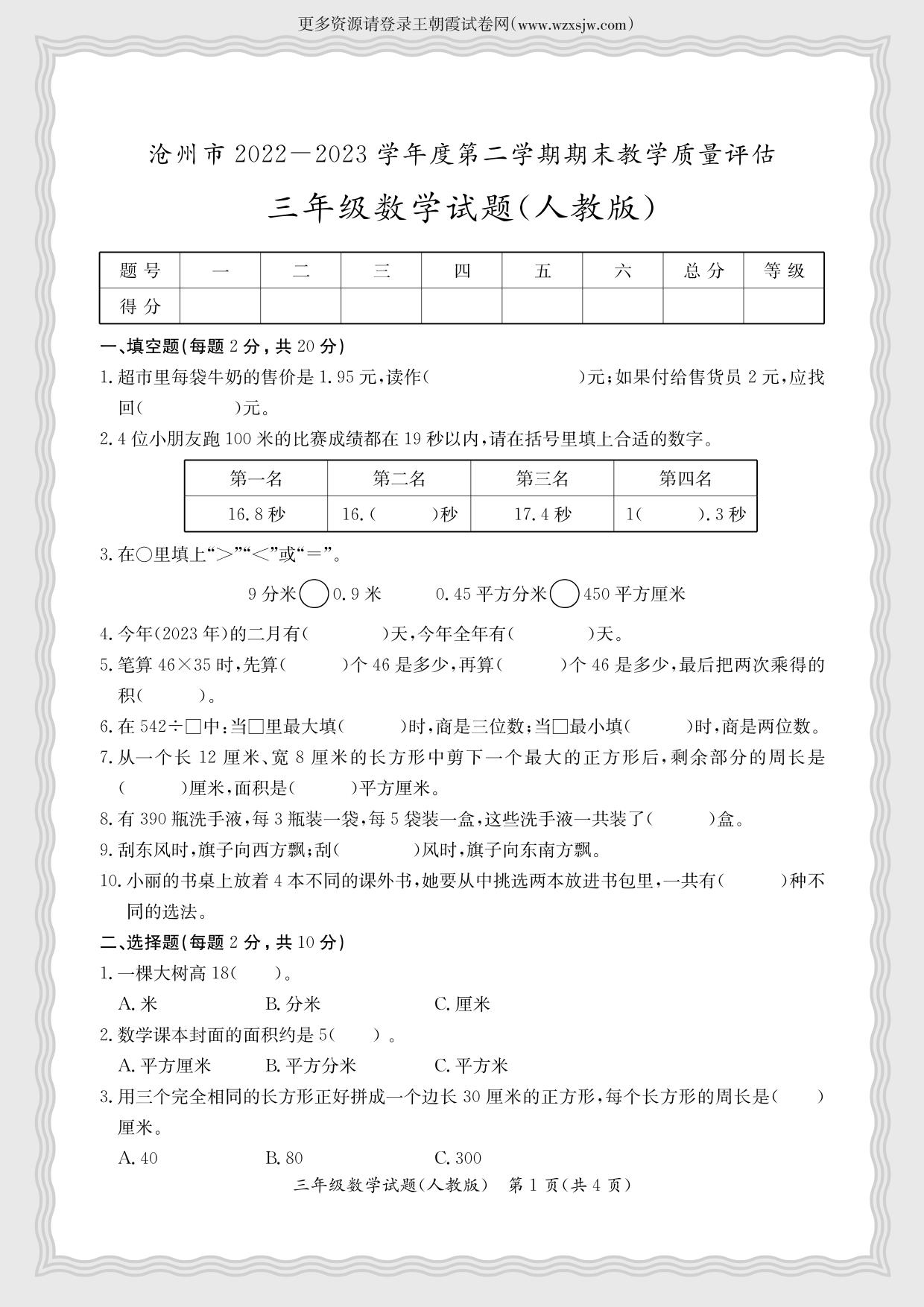 河北省沧州市2022-2023学年度第二学期期末教学质量评估试题三年级数学(人教版)