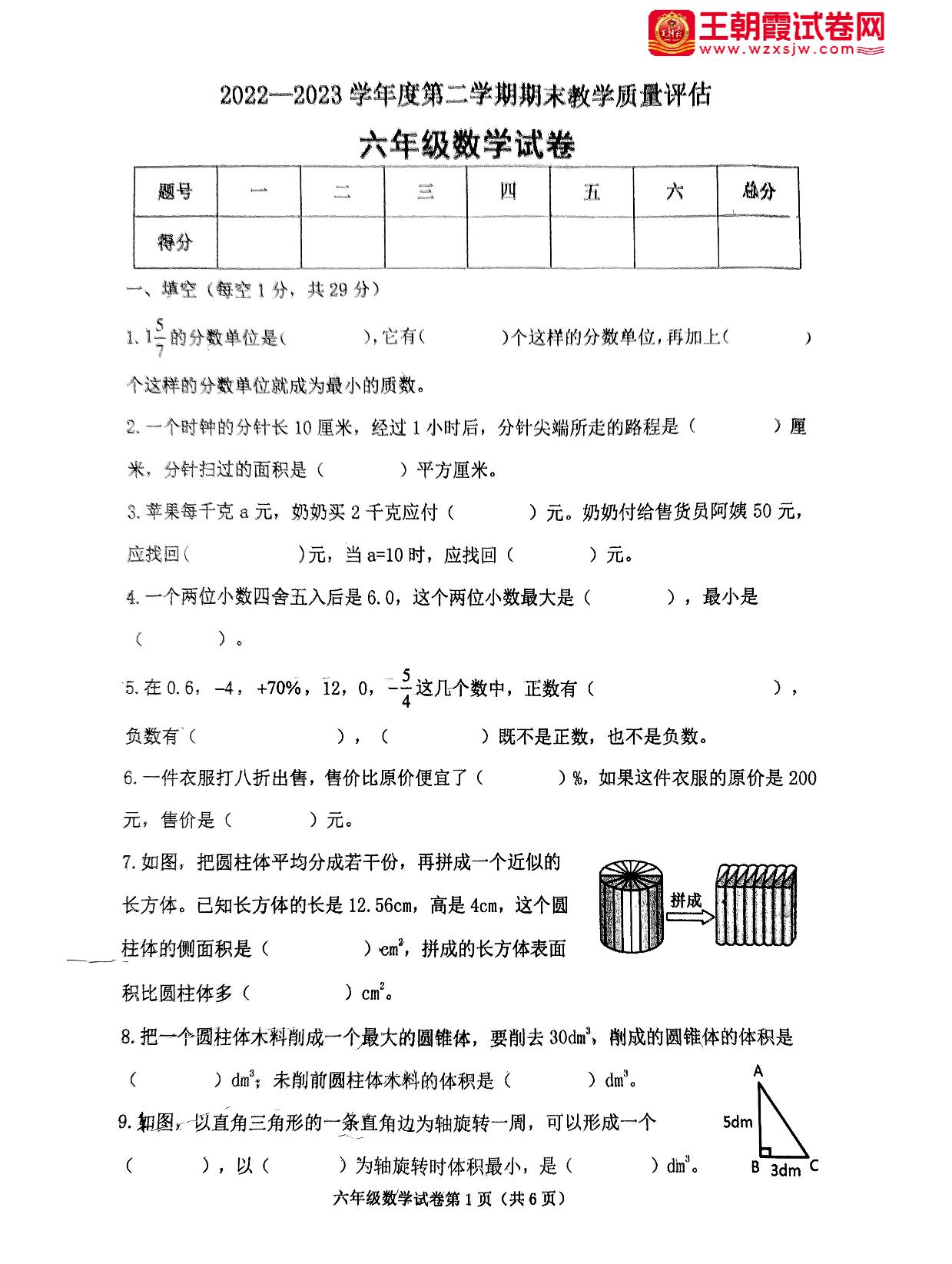 河北省沧州市青县2022-2023学年度第二学期期末教学质量评估试卷六年级数学(人教版)