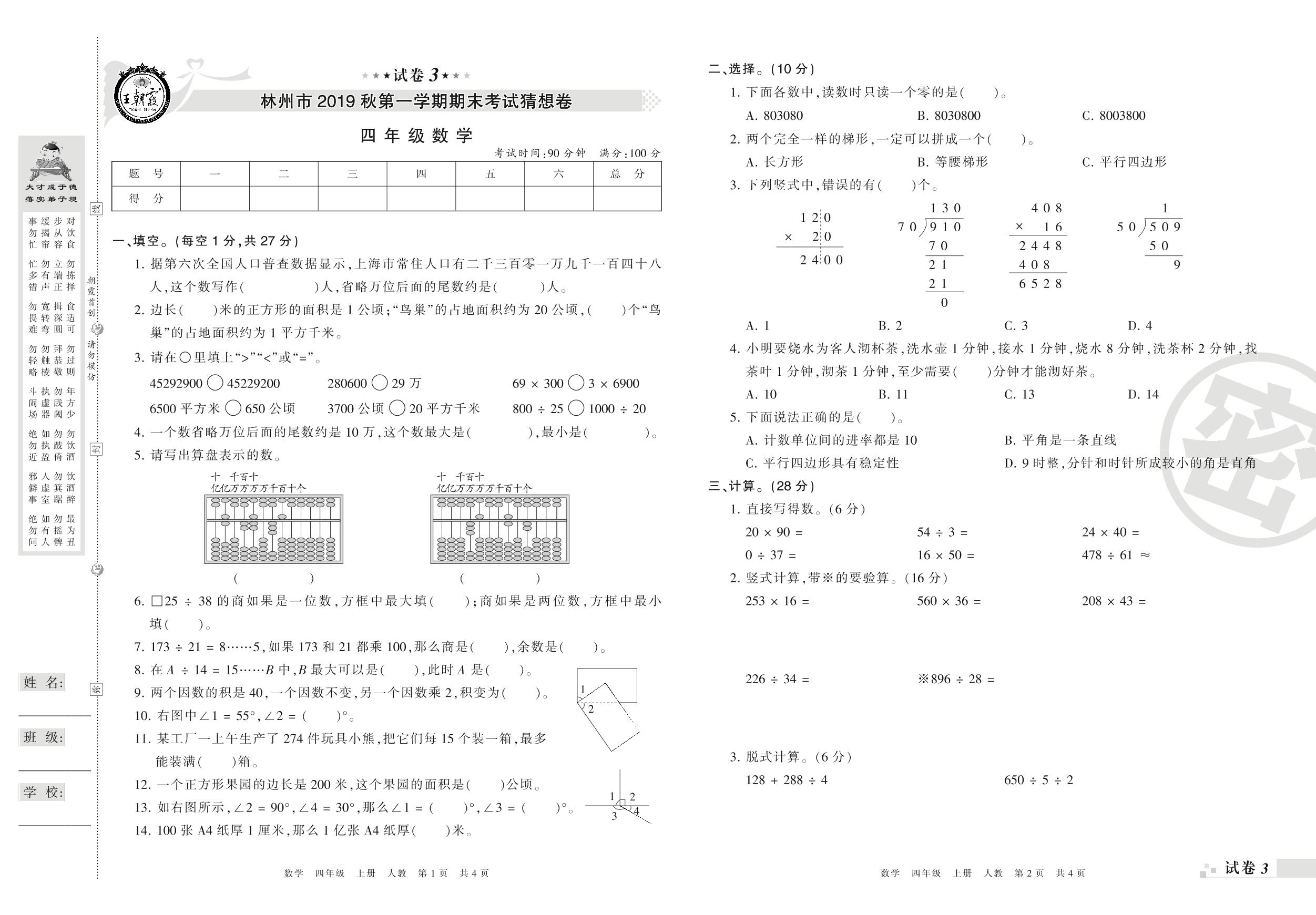 2018-2019学年第一学期林州市猜想卷四年级数学试卷(人教版)【3】