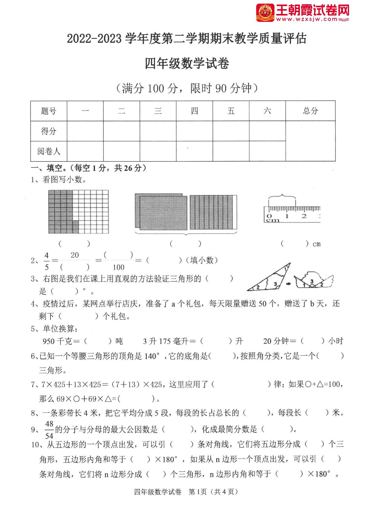 河北省沧州市盐山县2022-2023学年度第二学期期末教学质量评估试题四年级数学(冀教版)