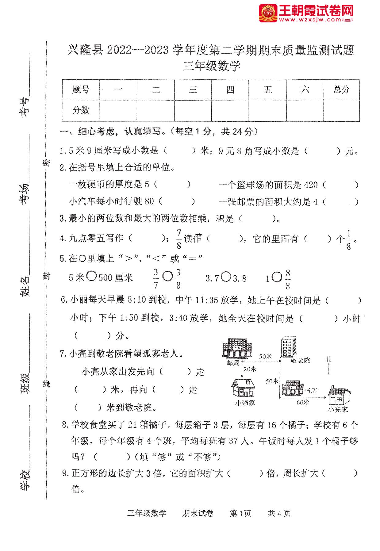 三年级数学人教版下册期末卷