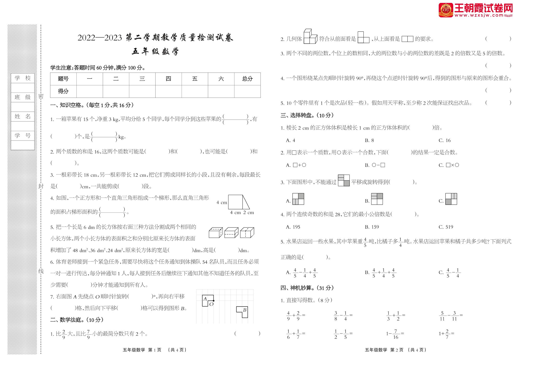 河北省衡水市景县2022-2023学年第二学期期末教学质量检测试卷五年级数学(人教版)