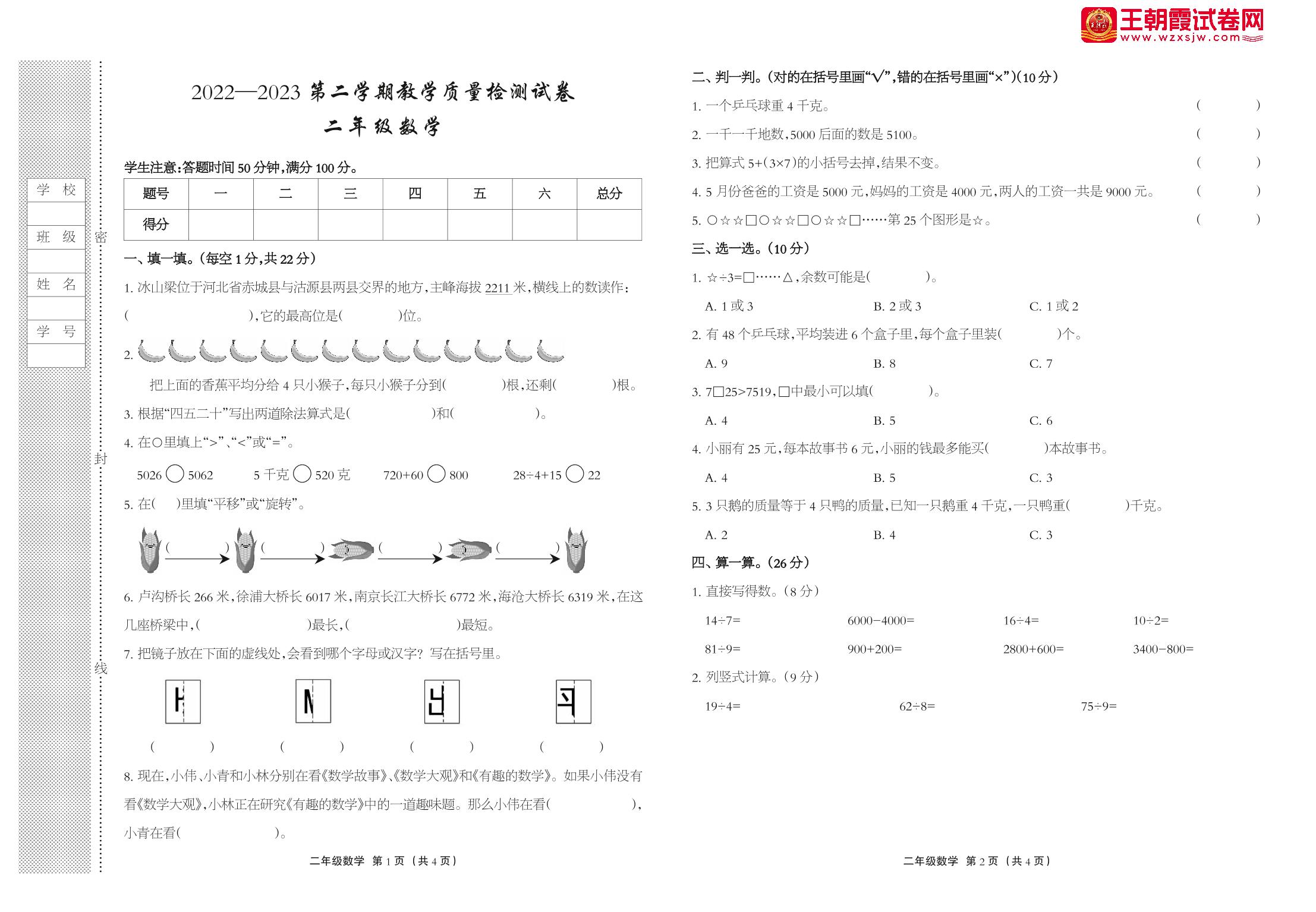 河北省衡水市景县2022-2023学年第二学期期末教学质量检测试卷二年级数学(人教版)