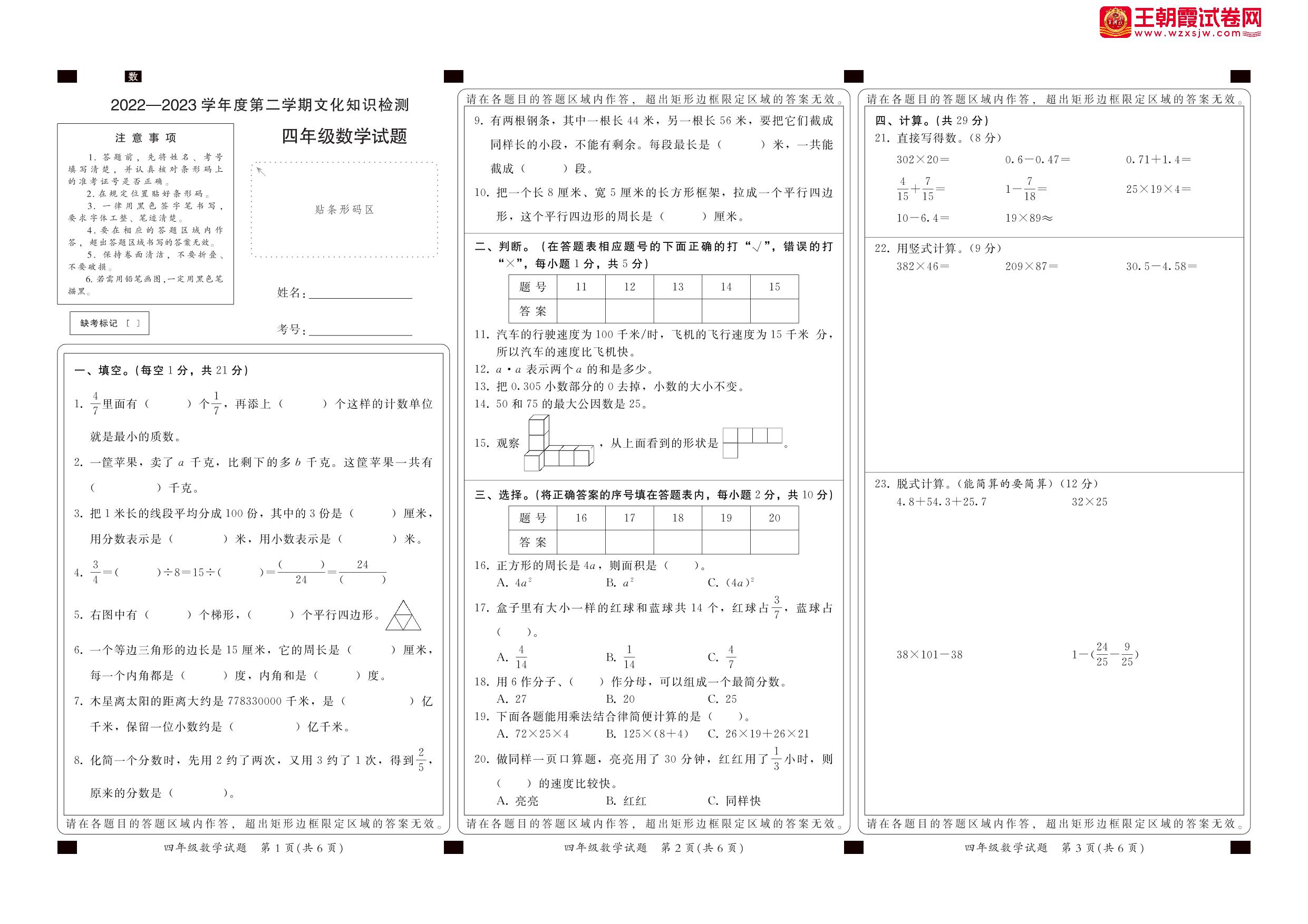 河北省邯郸市邱县2022-2023学年第二学期期末文化知识检测试题四年级数学(冀教版)