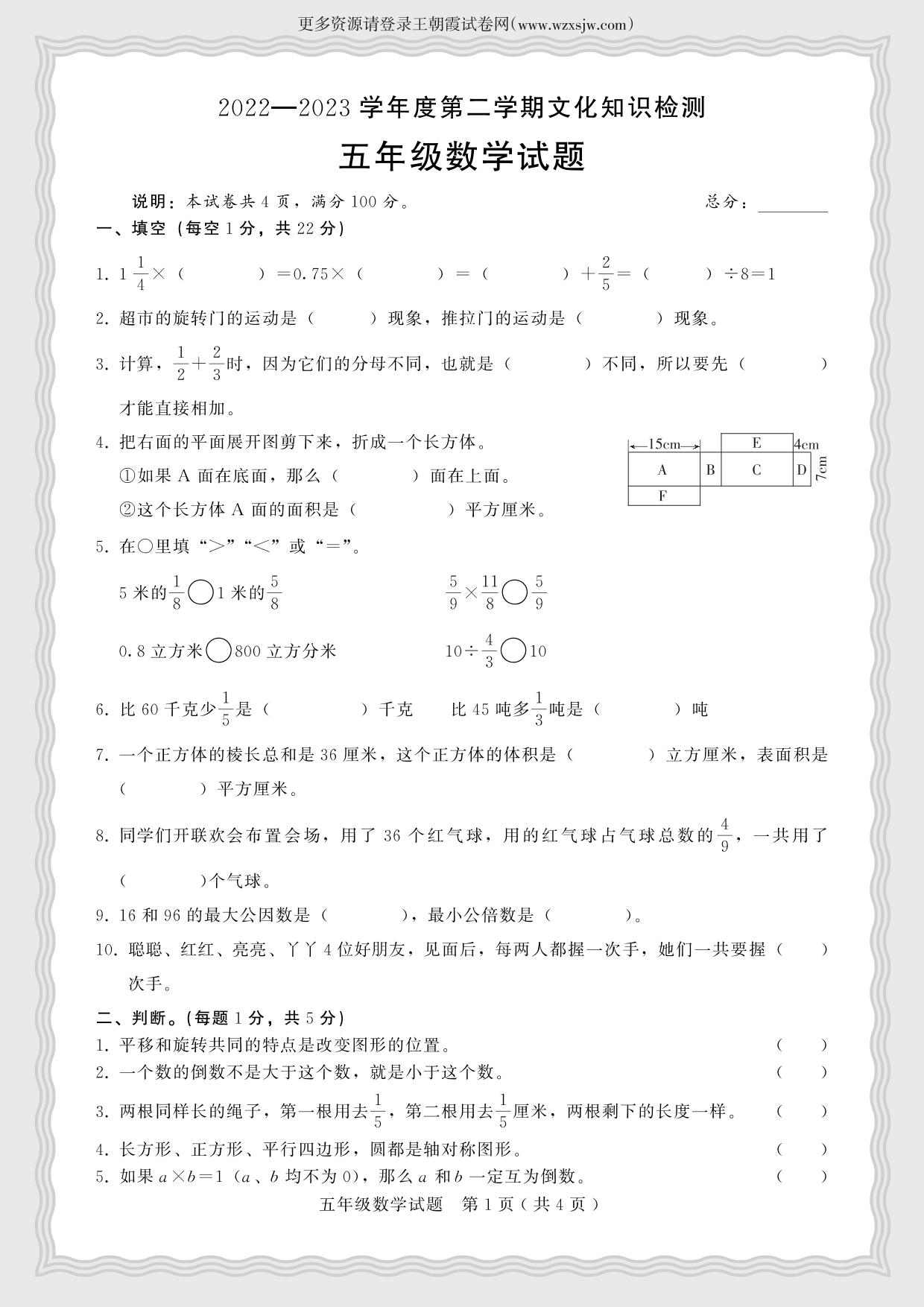 河北省邯郸市邱县2022-2023学年第二学期期末文化知识检测试题五年级数学(冀教版)
