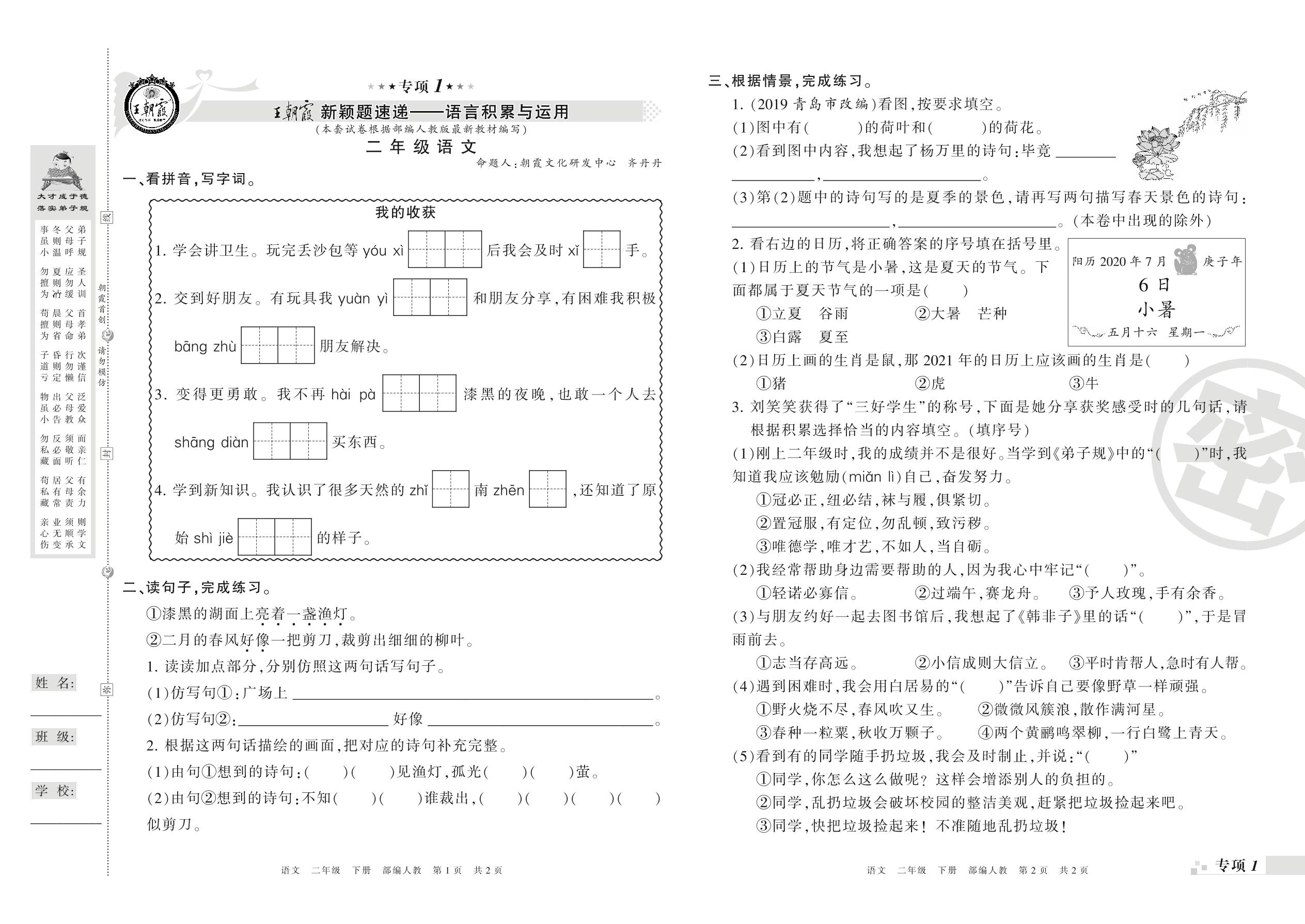 王朝霞期末专项卷——新颖题速递:语言积累与运用、非连续性文本阅读二年级下册语文(人教版)_R21080170000【0】