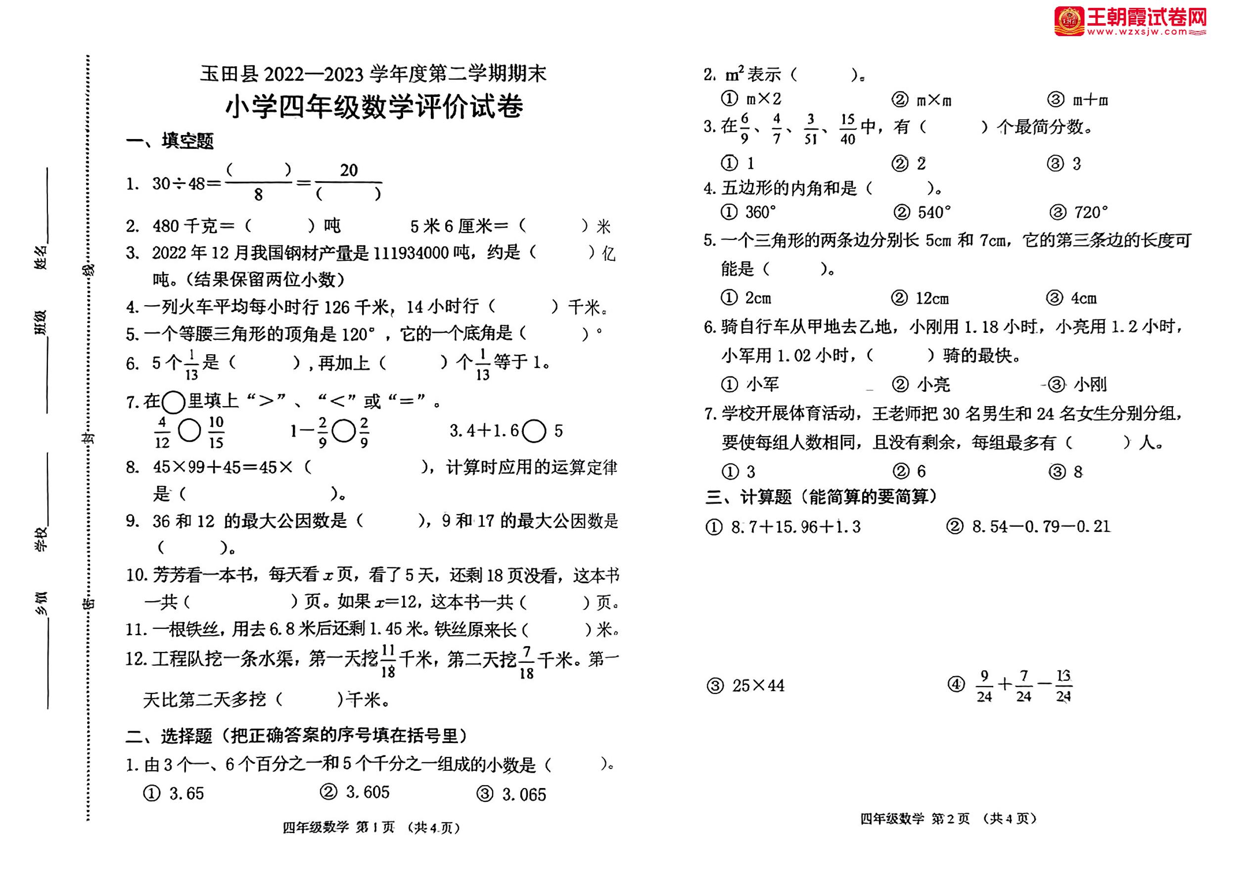河北省唐山市玉田县2022-2023学年度第二学期期末评价试卷四年级数学(冀教版)